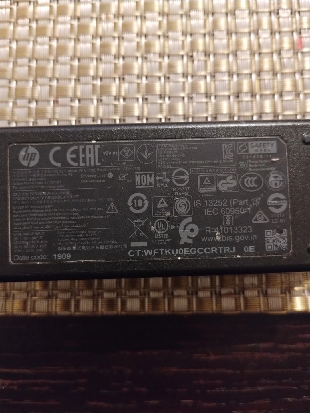Selling an HP laptop charger, model HSTNN-CA40. It's in good working condition and ready to power your laptop! Date code: 2019 September.