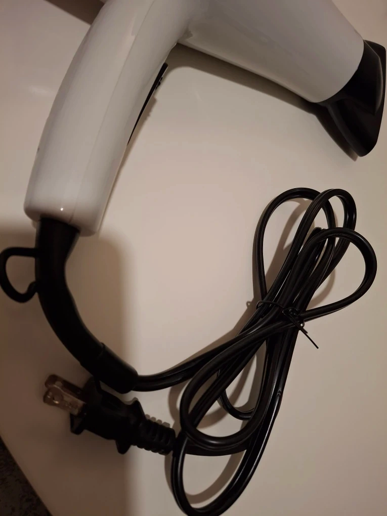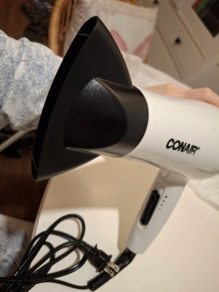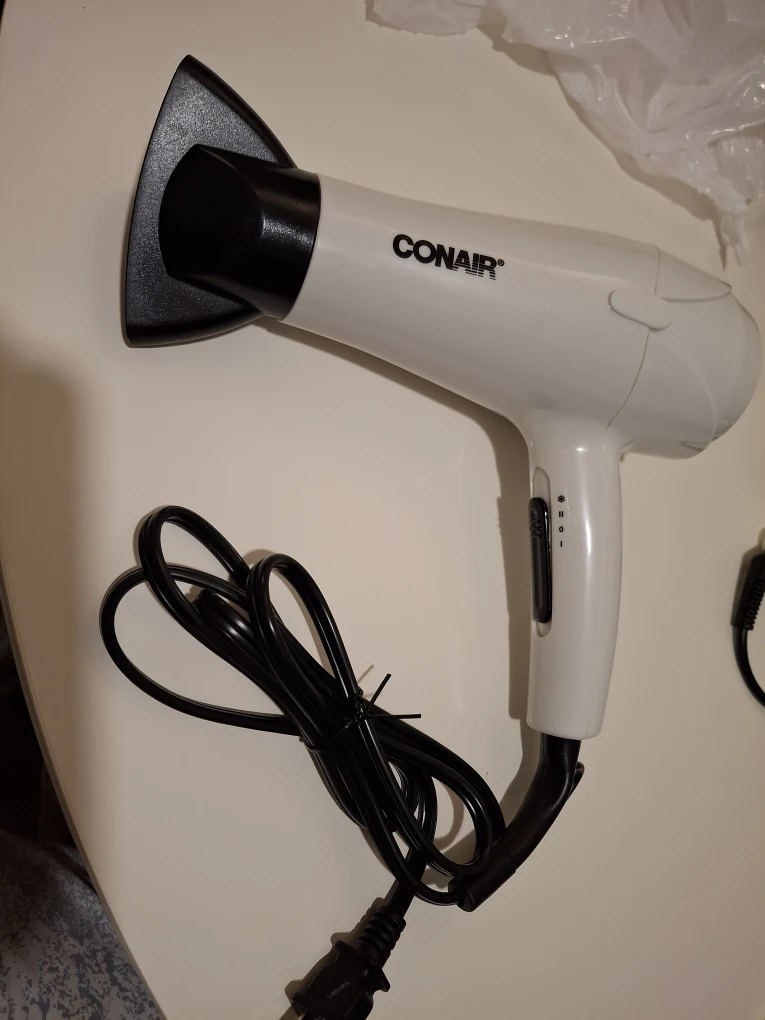 Selling a Conair hair dryer in great condition! It's white with a black nozzle and has different heat settings. Perfect for quick and easy styling