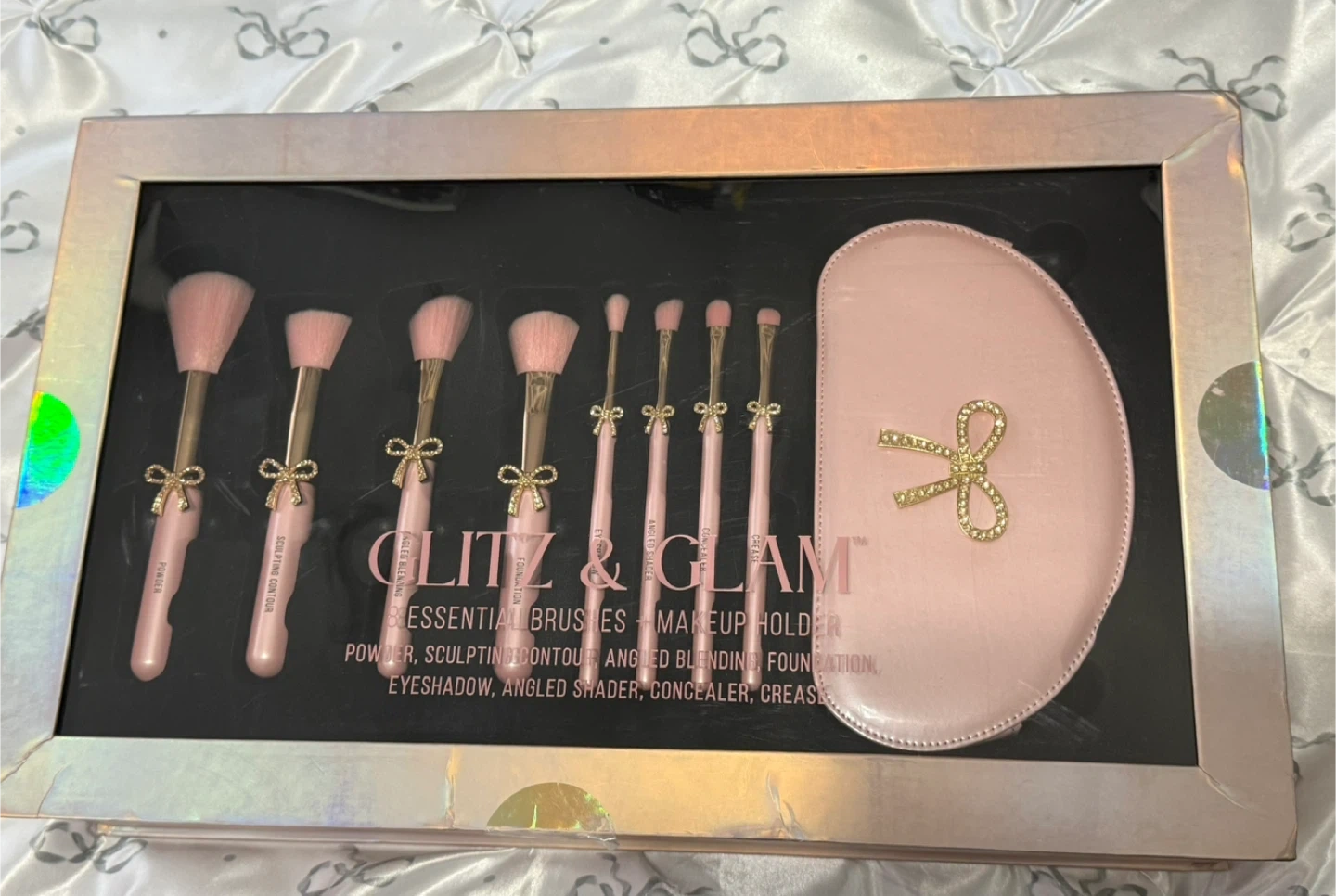 Selling a brand new Glitz & Glam essential brush set! This set includes a variety of brushes for powder, sculpting, contouring, angled blending, foundation, eyeshadow, angled shader, concealer, and crease application. It also comes with a cute makeup holder. Perfect for creating any look!