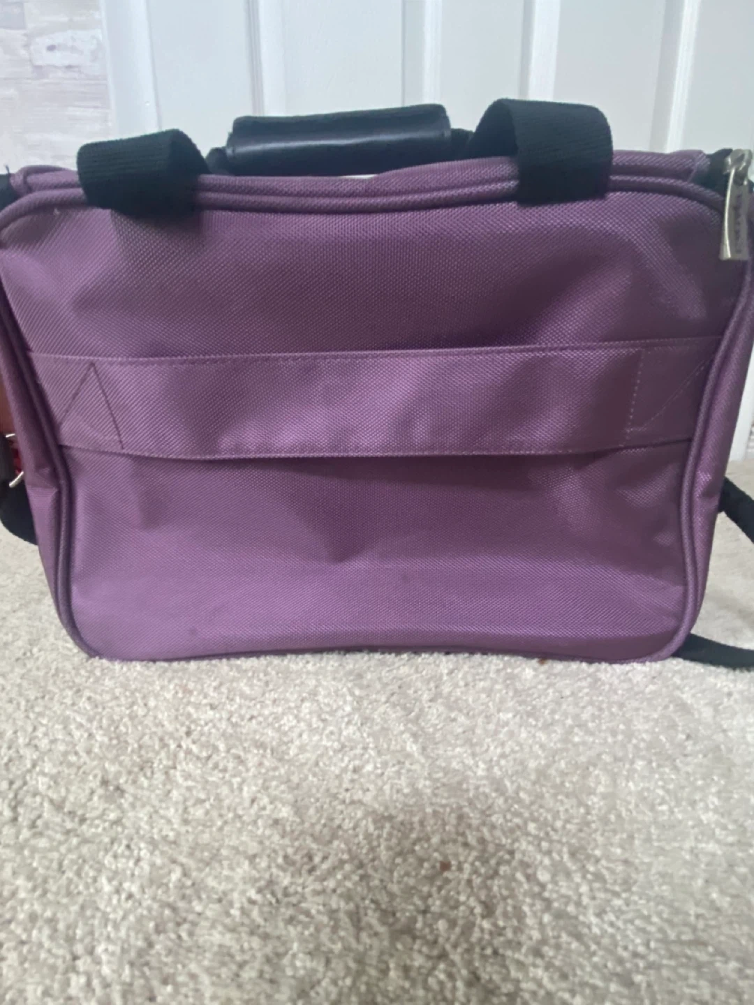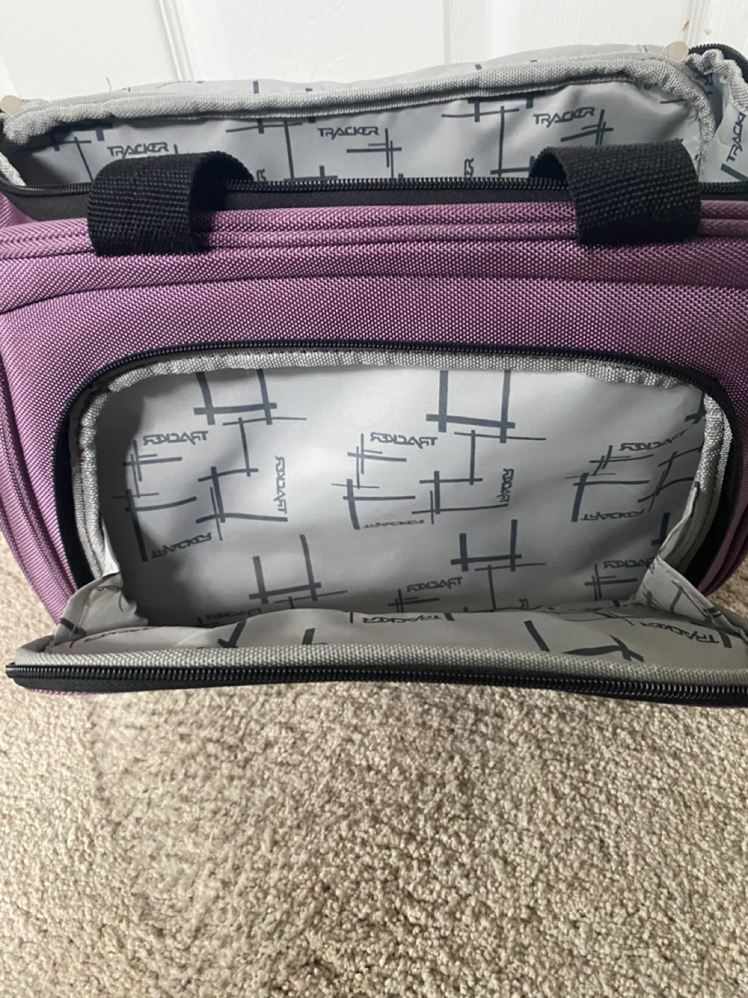 Here's a Tracker carry-on bag in a lovely purple colour! It features black handles and an adjustable removable shoulder strap for easy carrying.