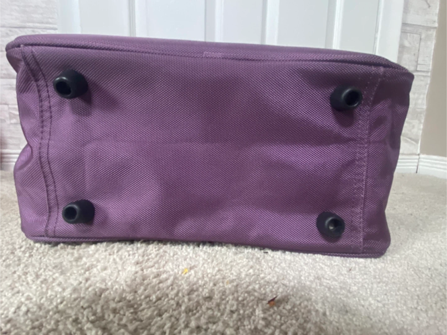 Main zippered compartment, front zippered compartment and 4 small feet on bottom of bag.