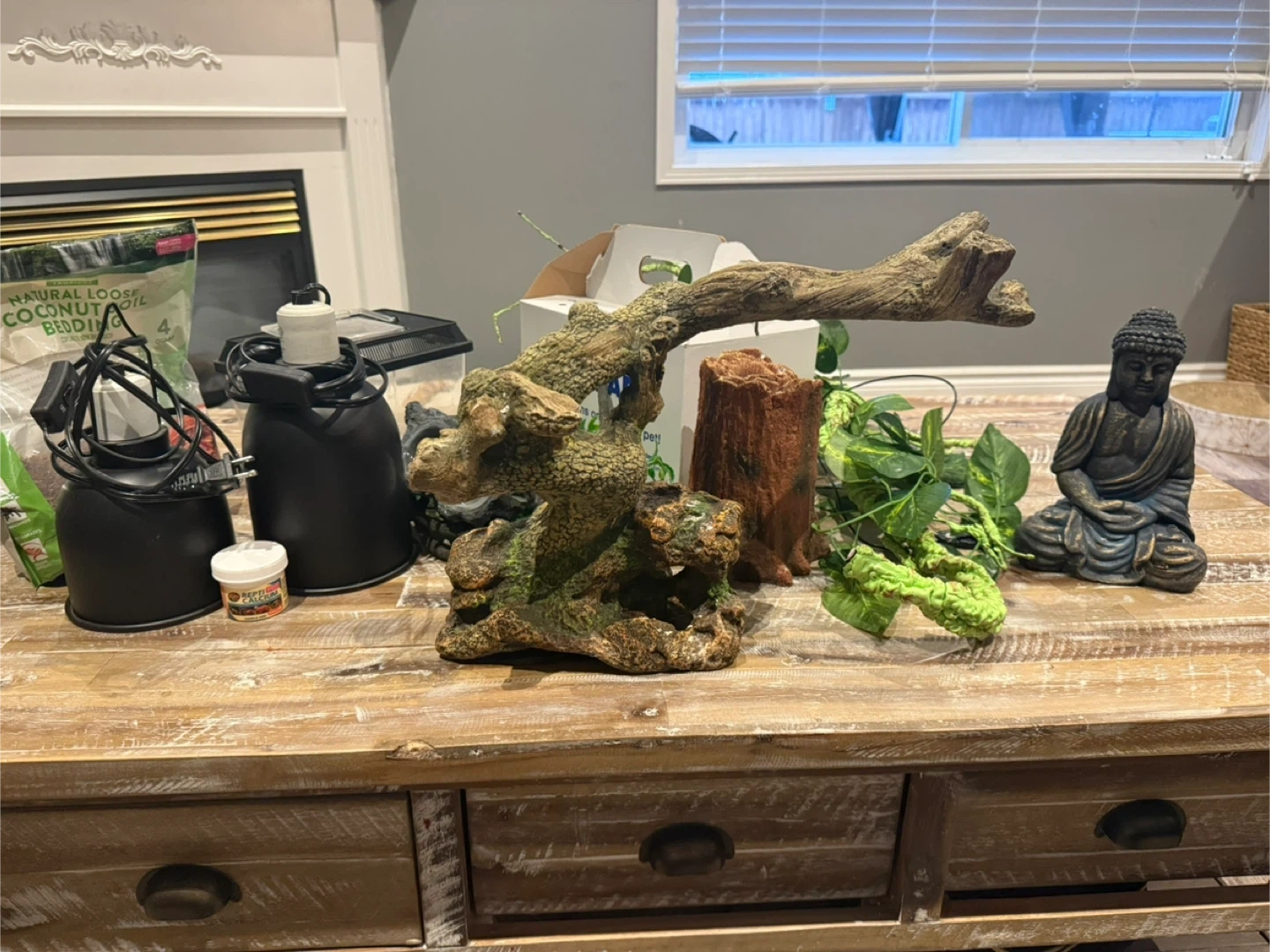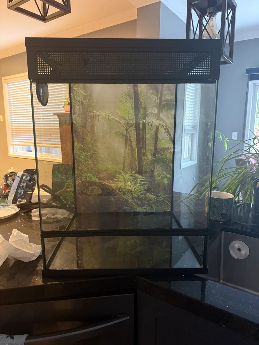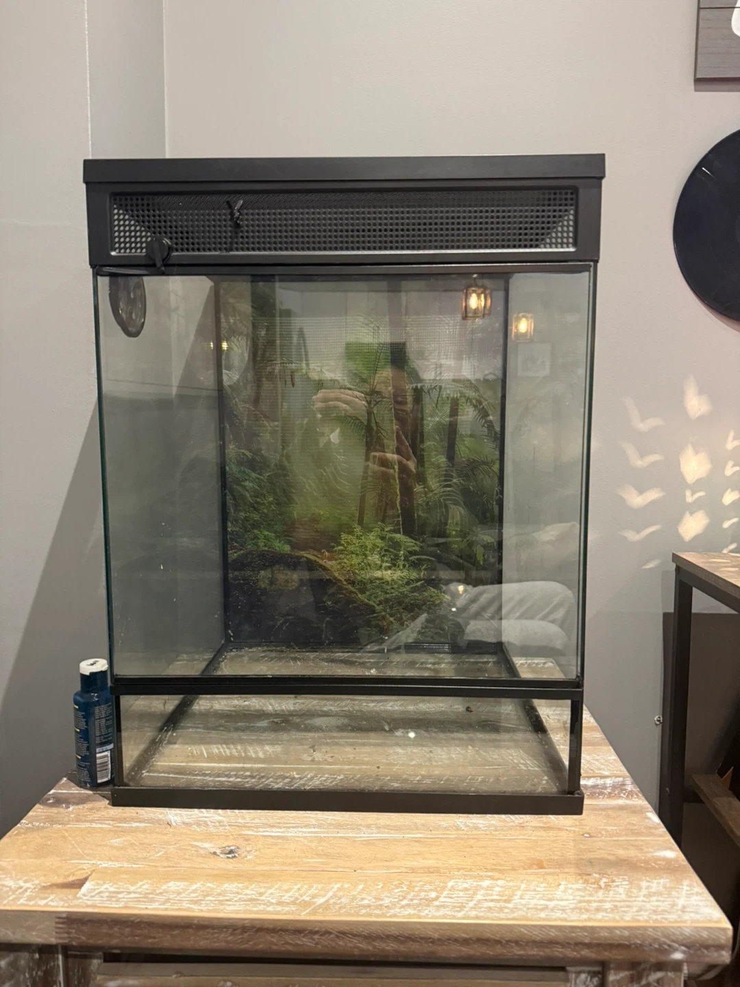 Selling an Exo Terra terrarium, perfect for reptiles or amphibians! It comes with some accessories, including two lamps, mister log, fountain and some artificial plants. Will need a sanitize before next resident, I did give it a good clean but can use more ! Bottom is still leak proof.