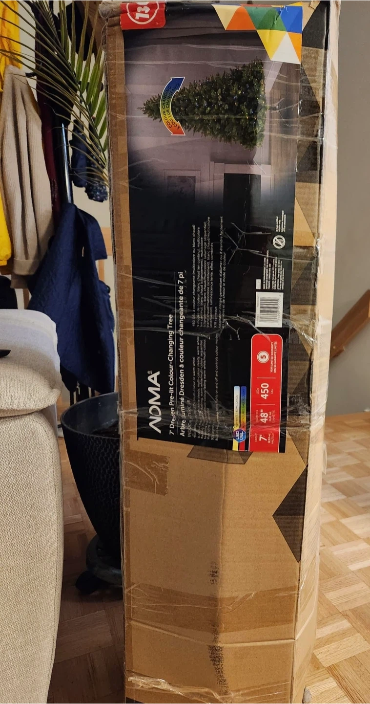 Sapin artificiel de 7 pieds NOMA, modèle Dresden Pre-lit / Colour-Changing Tree, avec 450 lumières DEL multicolores intégrées. Très beau rendu, facile à installer et prêt pour le temps des Fêtes. Boîte incluse, sapin en excellent état.