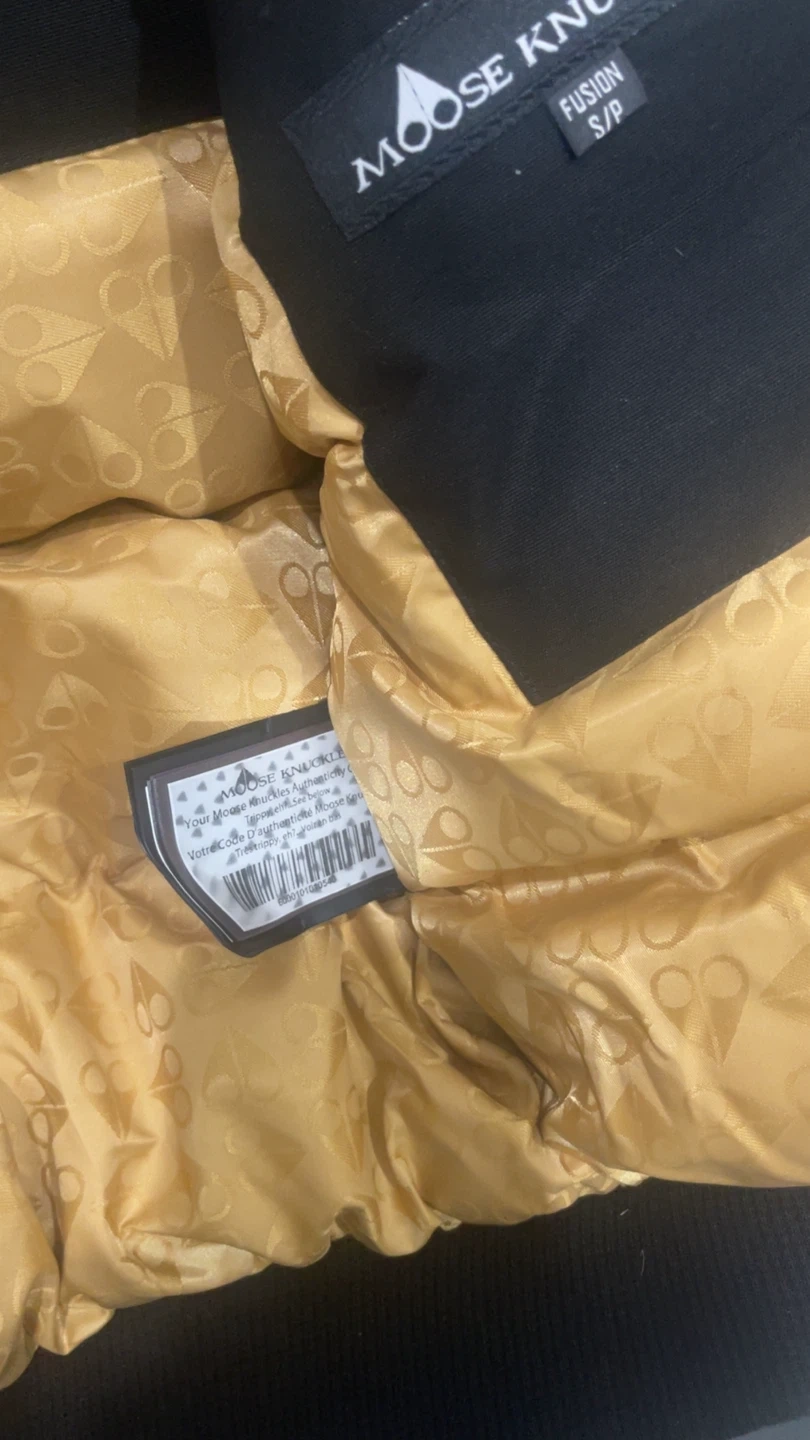 Selling a Moose Knuckles Fusion bomber jacket in size S/P. It's in great condition and ready for a new owner! The jacket features a black exterior with a gold interior lining, and the iconic Moose Knuckles logo on the sleeve. Was for my son originally but didn’t fit him.