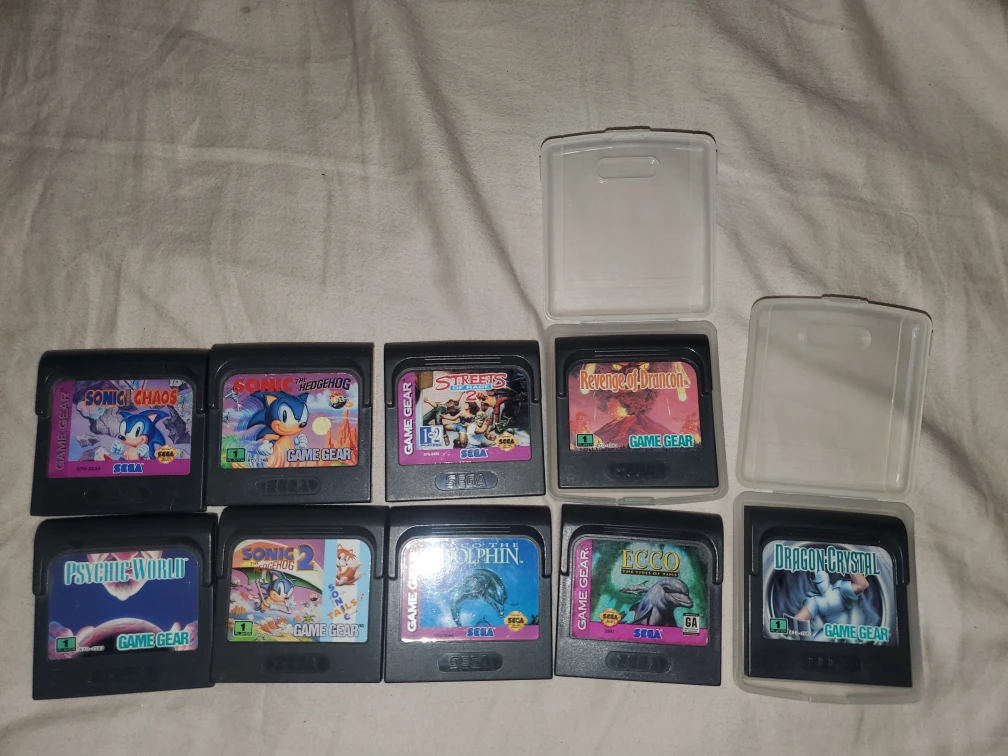 Selling a Sega Game Gear portable video game system. Included are the following games: Sonic Chaos, Sonic the Hedgehog, Streets of Rage, Revenge of Drancon, Psychic World, Ecco the Dolphin, and Dragon Crystal