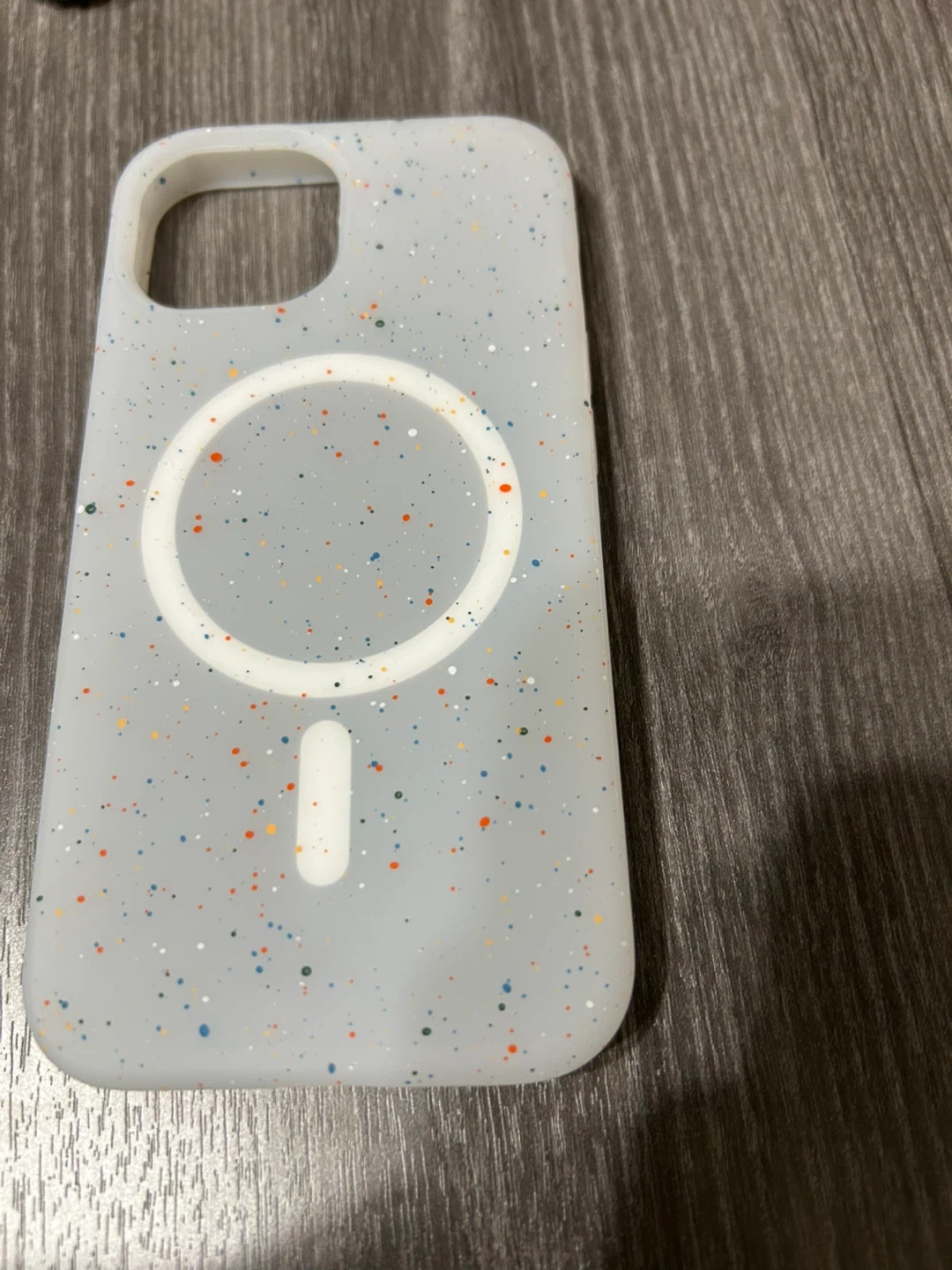 This phone case features a fun speckled design. It's MagSafe compatible for easy charging. The case is made of a durable material. Protect your phone with style!