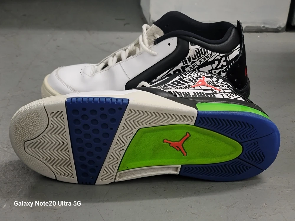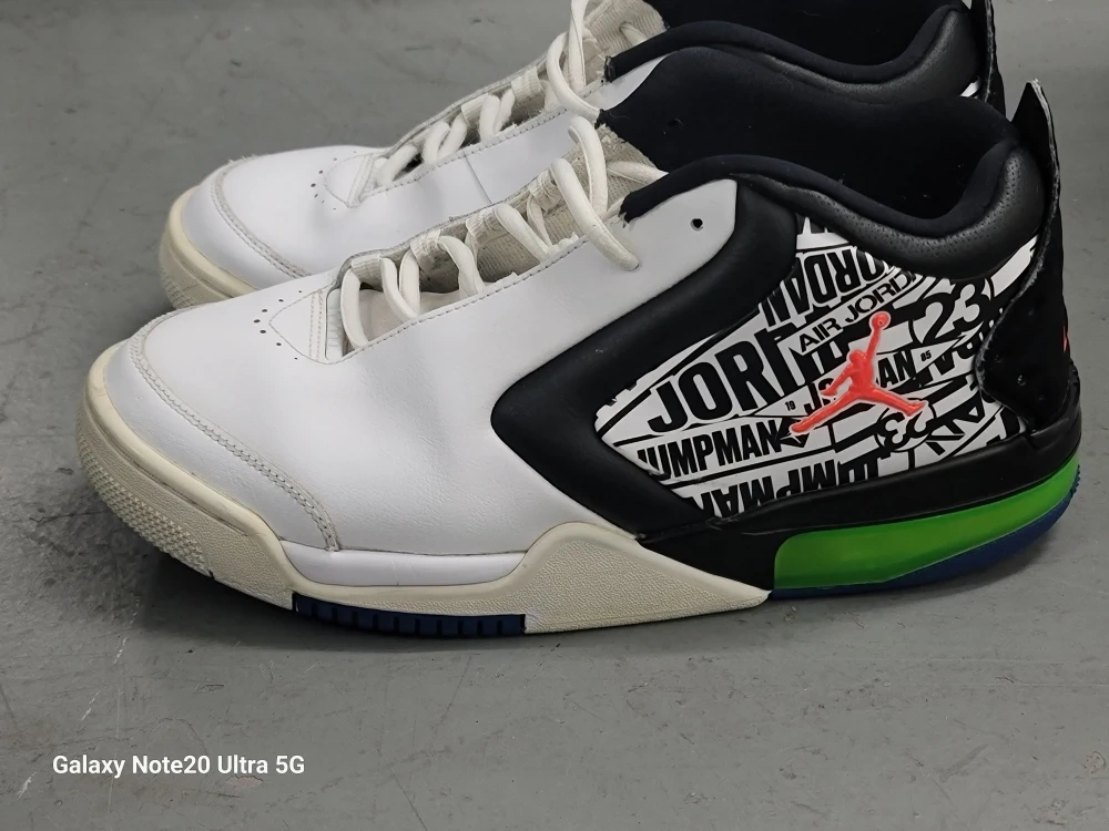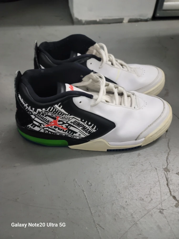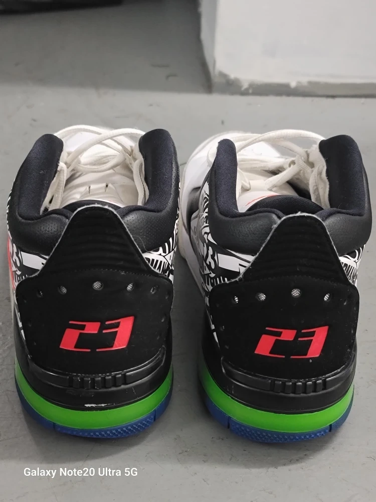 Selling a pair of Jordan 23 Alpha Trunner basketball shoes. They have a white, black, and green color scheme with the number 23 on the back. The shoes show some signs of wear but are still in good condition for playing or casual wear....Vendo zapatillas de baloncesto Jordan 23 Alpha Trunner. Tienen una combinación de colores blanco, negro y verde con el número 23 en la parte trasera. Presentan algunas señales de uso, pero aún están en buen estado para jugar o para uso casual..