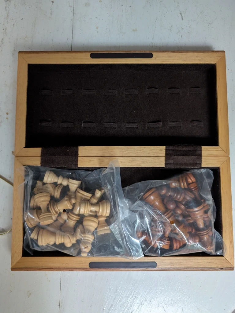 Selling a wooden chess set that comes complete with all the pieces and a board. The pieces are neatly packed in plastic bags. The board itself looks to be in great condition!