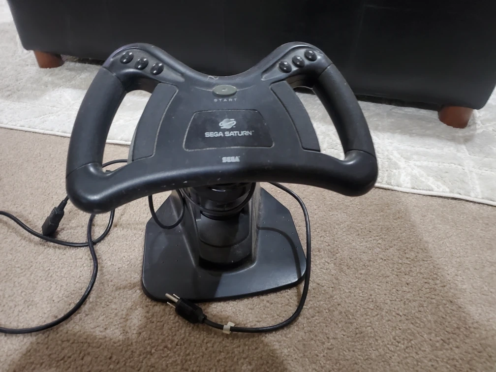 Selling a Sega Saturn console with a controller, racing wheel, and a selection of games. Titles include Clockwork Knight, Tomb Raider and Mortal Kombat 3.