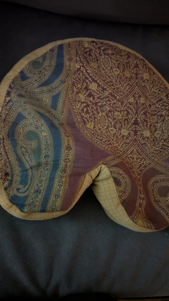 This eye pillow features a beautiful paisley pattern with shades of blue, purple, and gold. It's in great condition and perfect for relaxation or meditation.