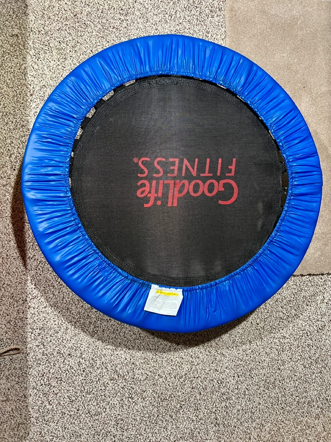A Goodlife Fitness trampoline for one person! Diameter 36” and height 8.5”. It's almost brand new and perfect for a fun and effective workout at home.