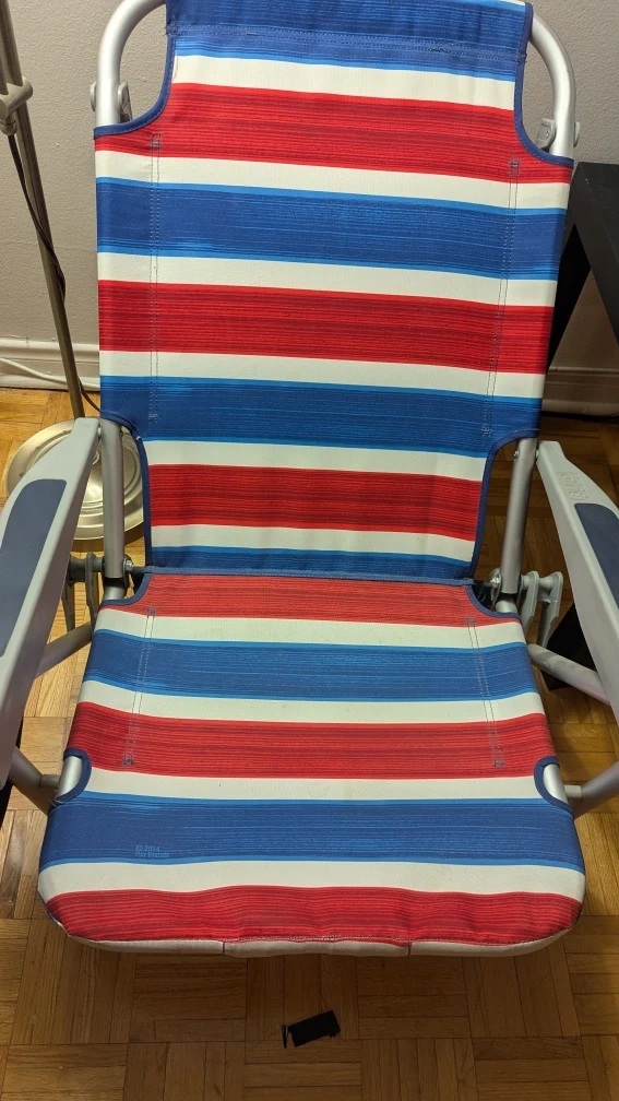 Here's a beach chair with a red, white, and blue striped pattern! It's lightweight and portable, perfect for a day at the beach or relaxing in the backyard