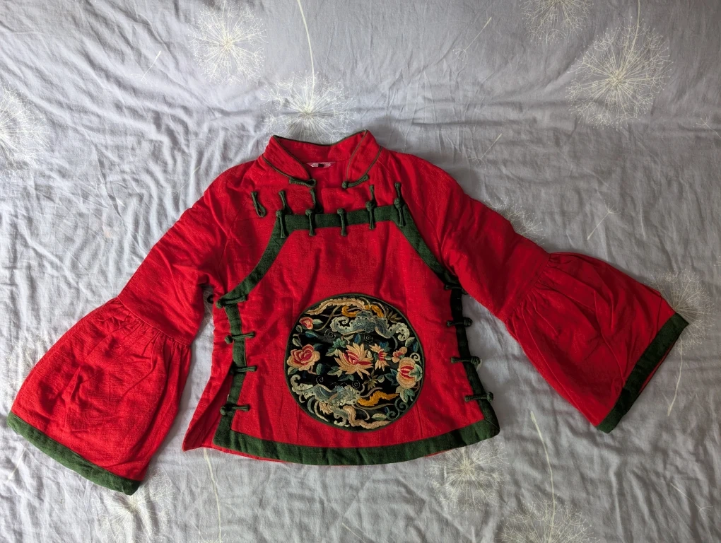 This is a lovely red jacket with Chinese-style detailing! It features green trim and a beautiful embroidered design on the front. The sleeves are a unique bell shape. It's in great condition and ready for a new home!
