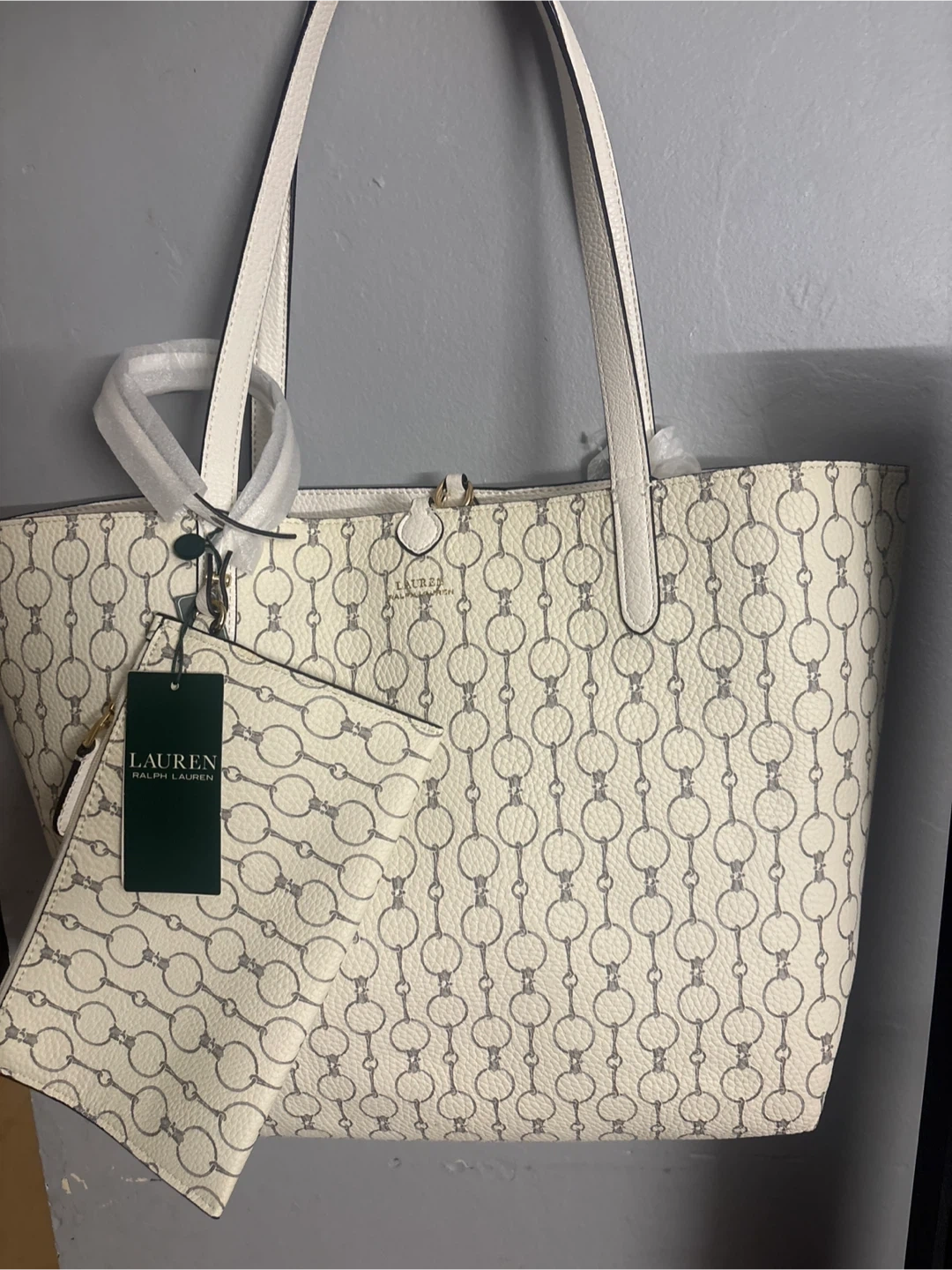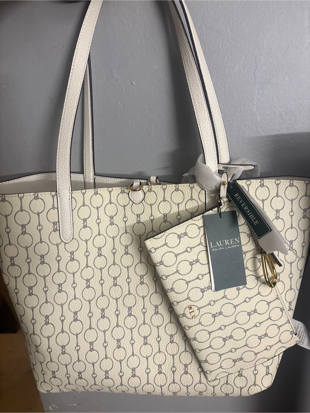 Selling a Ralph Lauren reversible tote bag with a VNLA chain pattern! It's in great condition and comes with a matching pouch. The size is OS (one size). Originally bought for $232.00