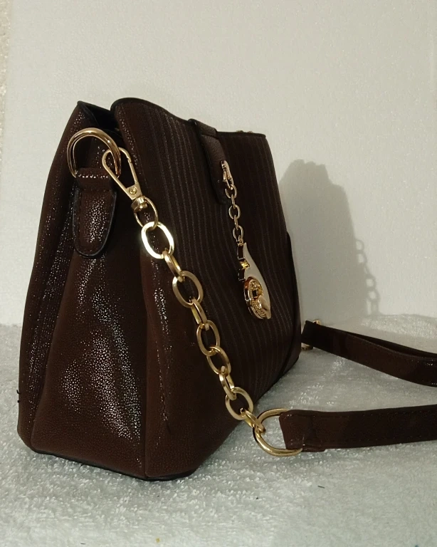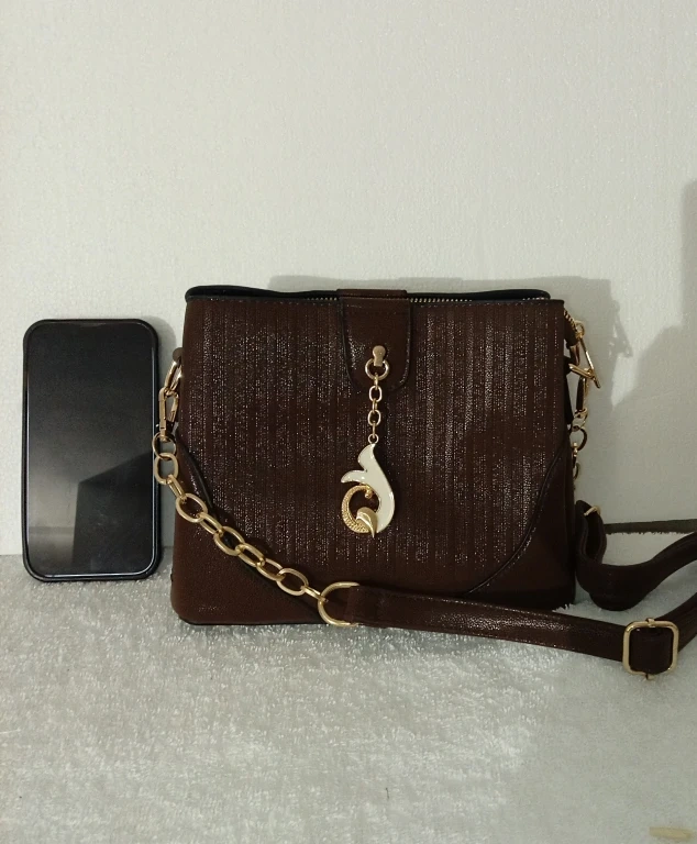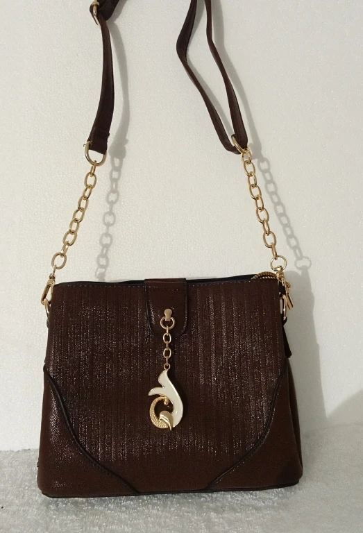 Here's a stylish brown shoulder bag! It features a gold chain strap and a unique pendant. The bag is in great condition and perfect for everyday use or a night out.