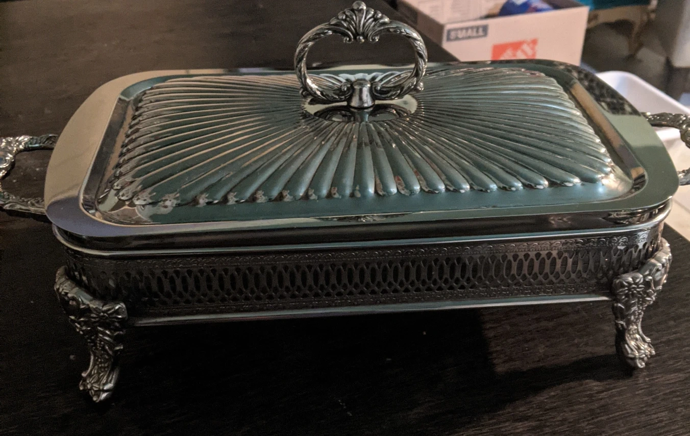 Selling a vintage silver plated chafing dish with a glass insert. It's in good condition and would be perfect for serving food at your next gathering! It has an ornate design and adds a touch of elegance to any table setting