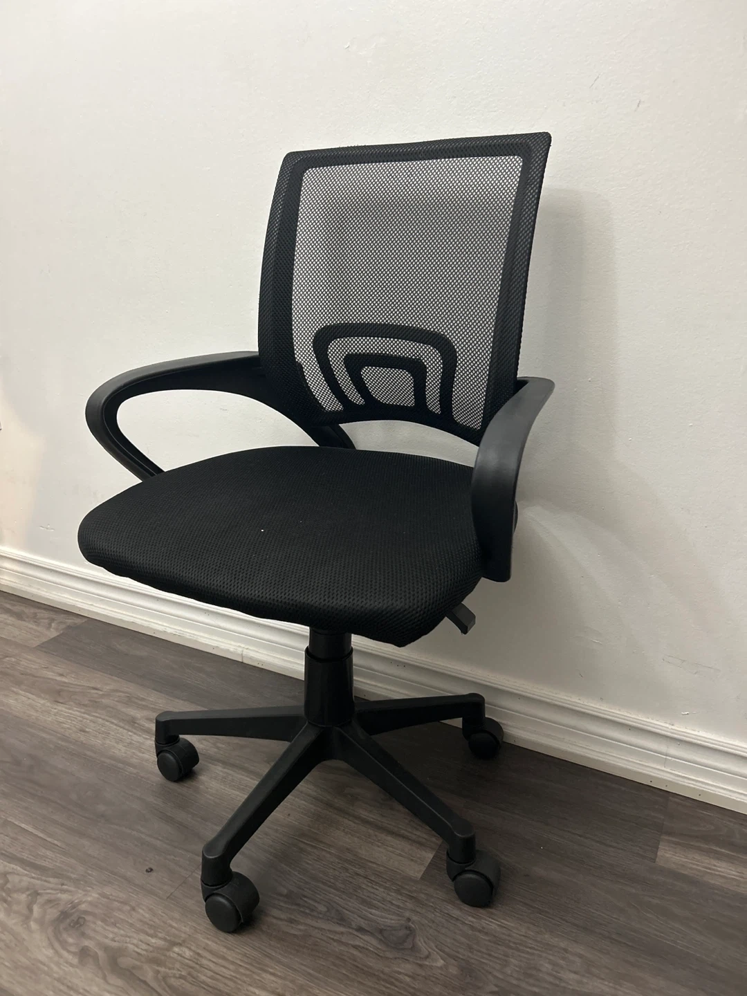 Selling a comfortable black mesh office chair. It's in good condition and ready to use in your home office or workspace! The mesh back provides great support and breathability.