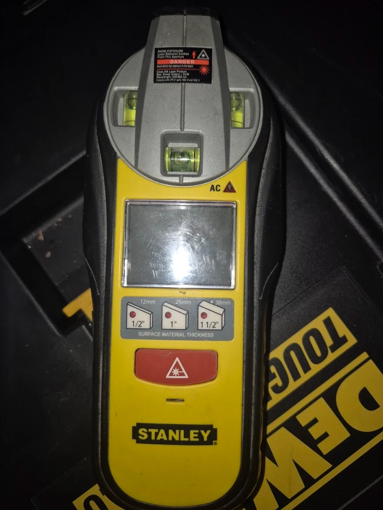 Selling a Stanley IntelliLaser Pro stud finder. It's in good condition and ready to help with your next project. It can detect studs through various surface material thicknesses: 1/2", 1", and 1 1/2".
