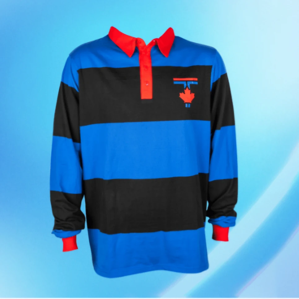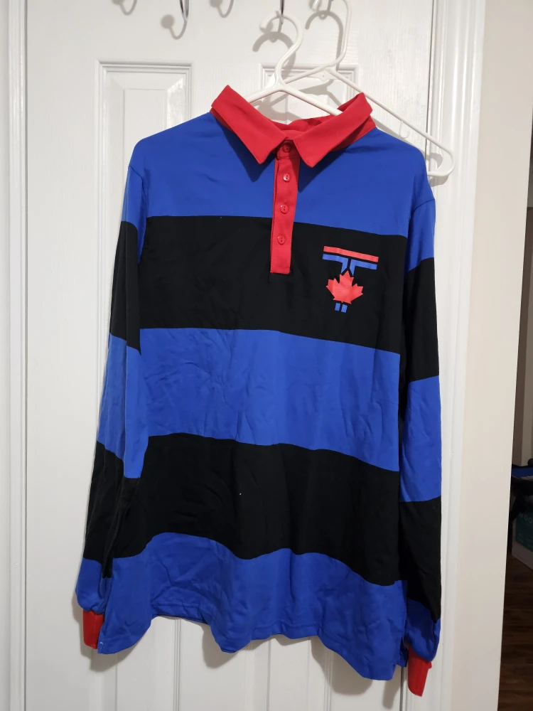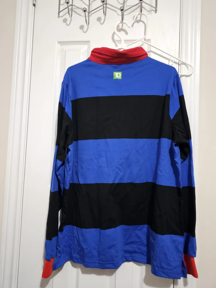 Selling a TD Canada Trust rugby shirt. It features a bold striped pattern in blue and black, with red accents on the collar and cuffs. The TD logo is on the back of the collar, and a maple leaf design is on the front.