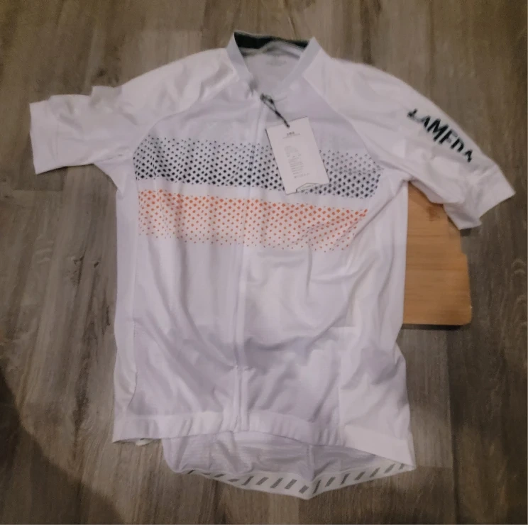 Selling a LAMEDA short sleeve cycling jersey in white. It's a size L/XL (US/EU sizing). The jersey is made of 100% polyester and features a stylish design.