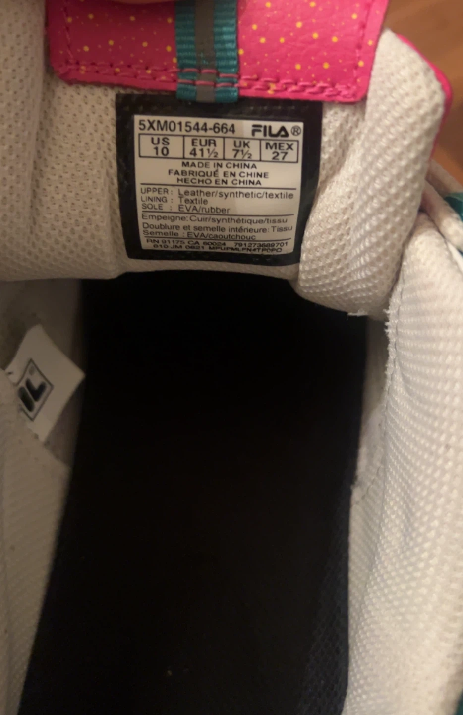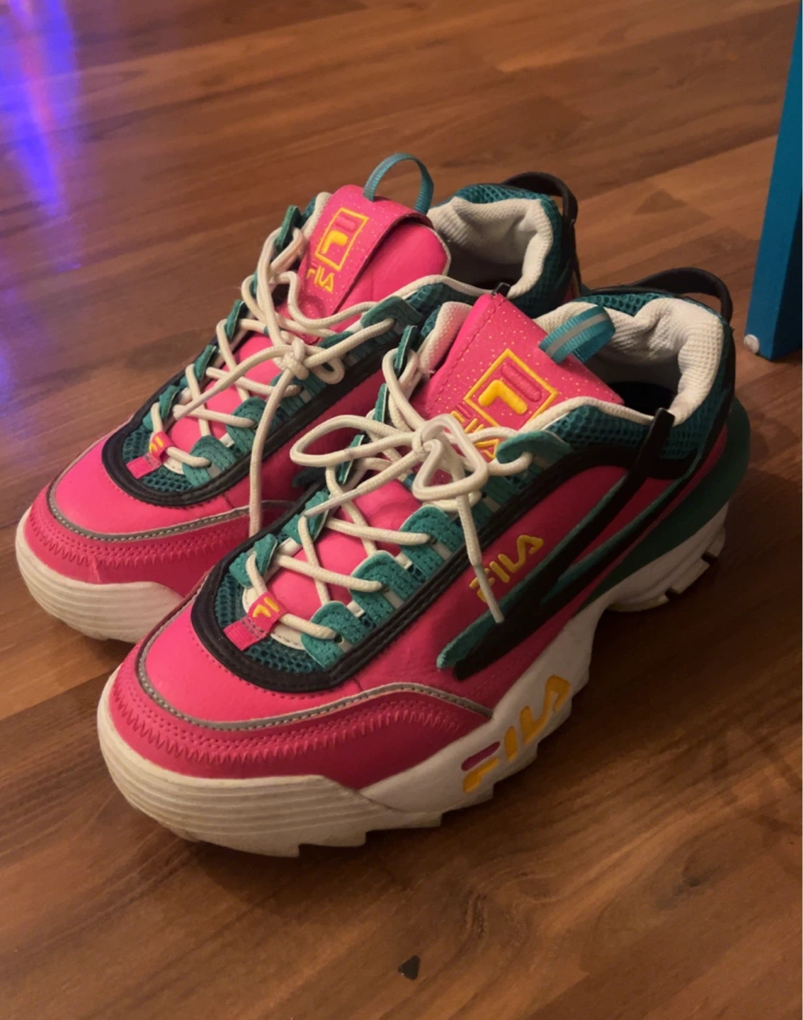 Selling a pair of Fila Disruptor sneakers. They are a US size 10. The sneakers have a unique pink, green, and black colourway. They show some signs of wear.