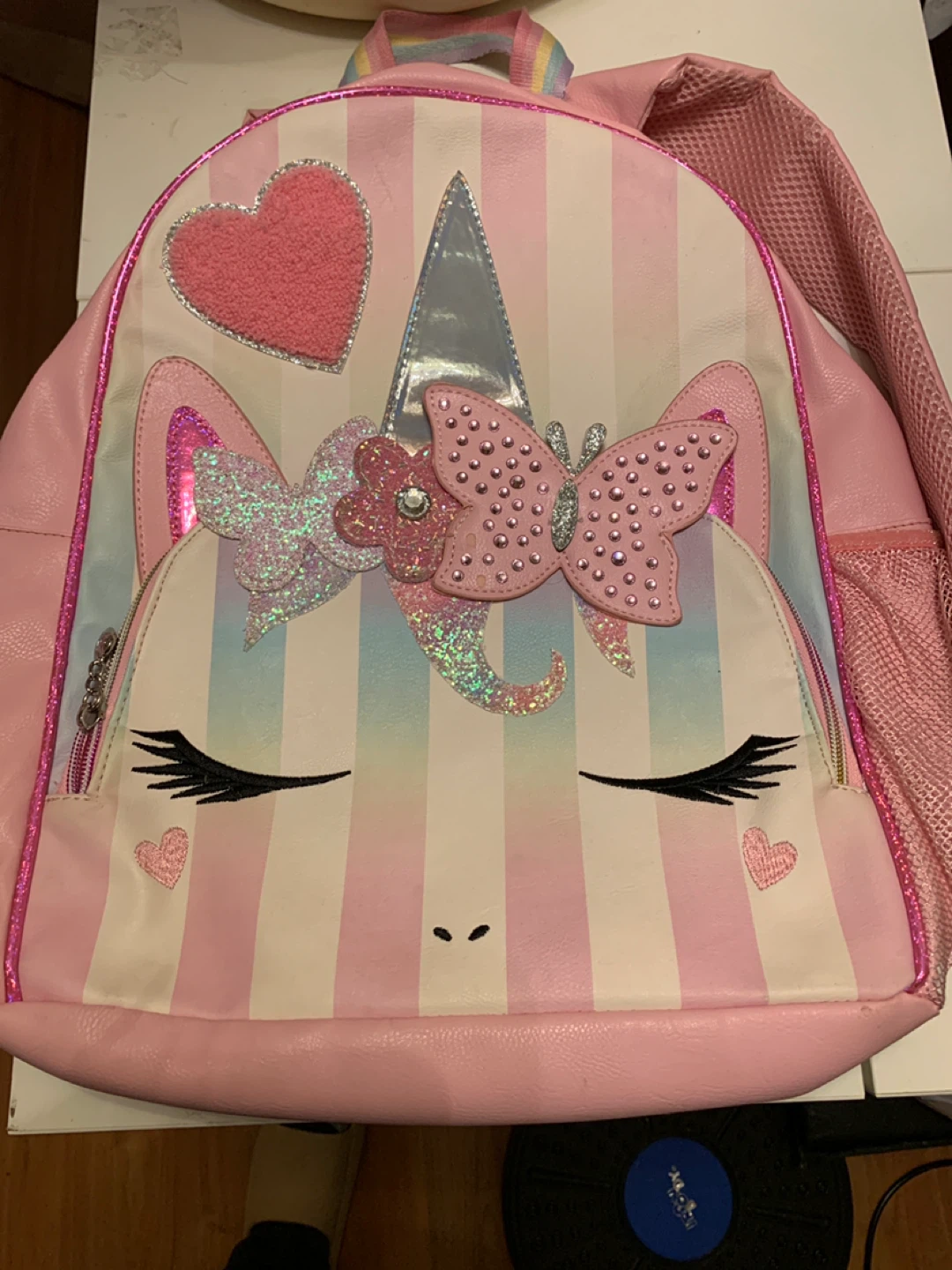 This is a cute pink unicorn backpack! It has a heart, unicorn horn, and butterfly on the front. The inside lining has pink and white stripes. Perfect for a little one!