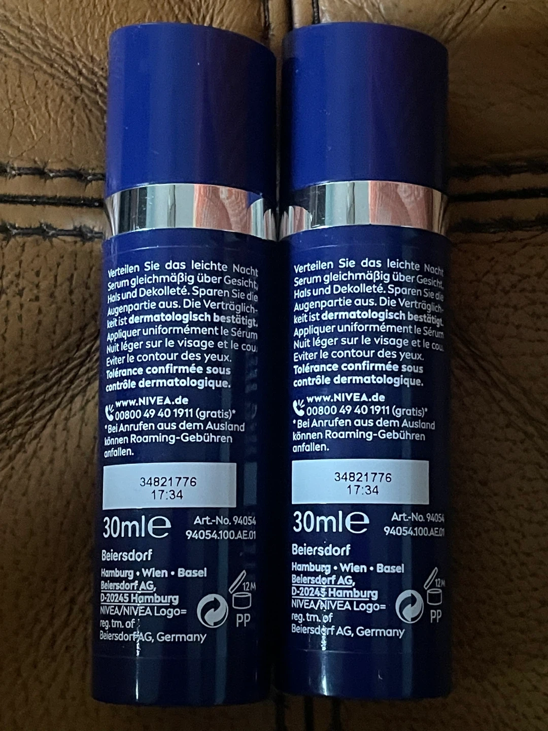 Selling two bottles of Nivea Q10 Anti-Falten Power Multi Regenerierendes Nacht Serum. Each bottle contains 30ml of night serum. They are dermatologically approved and can be applied uniformly to the face, neck, and décolleté.