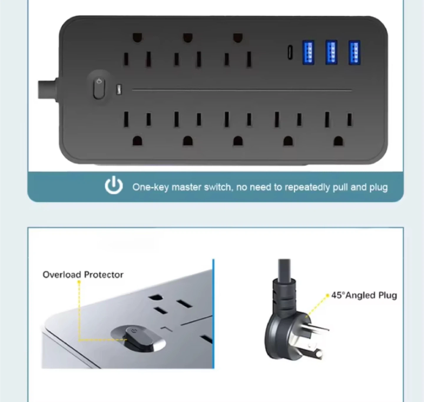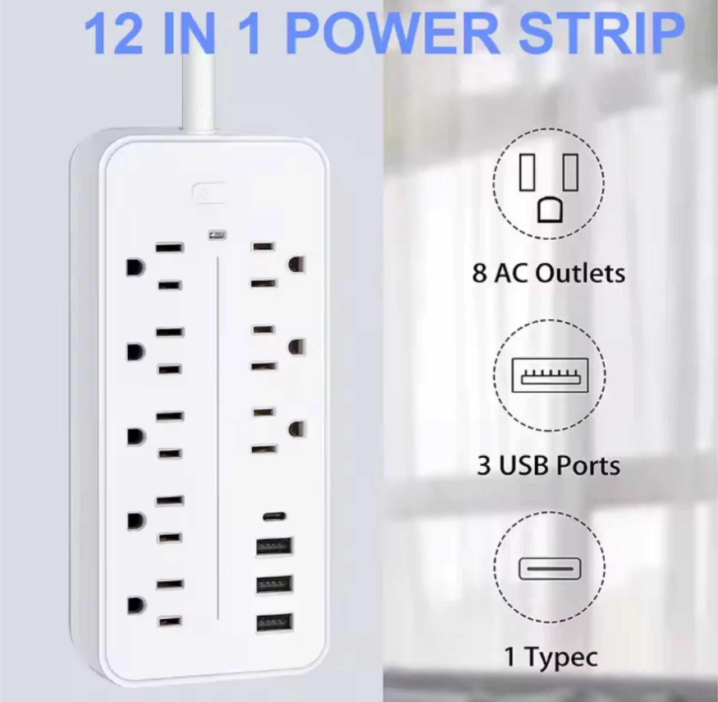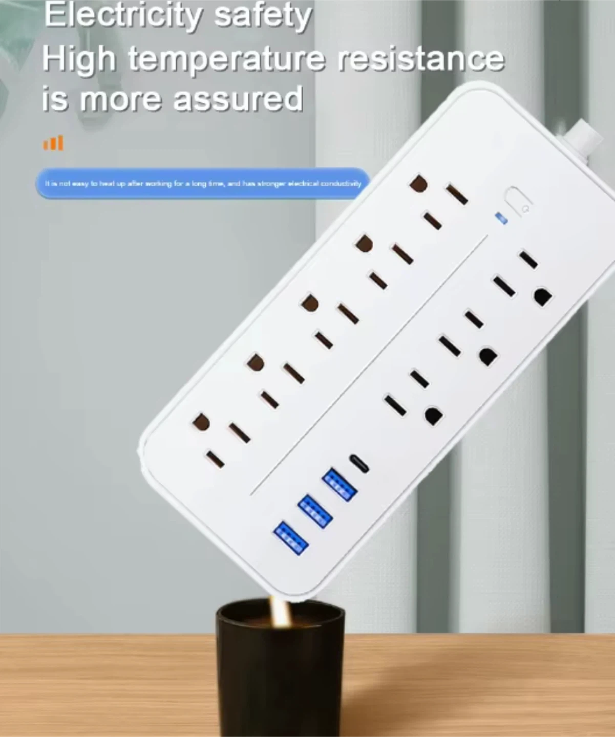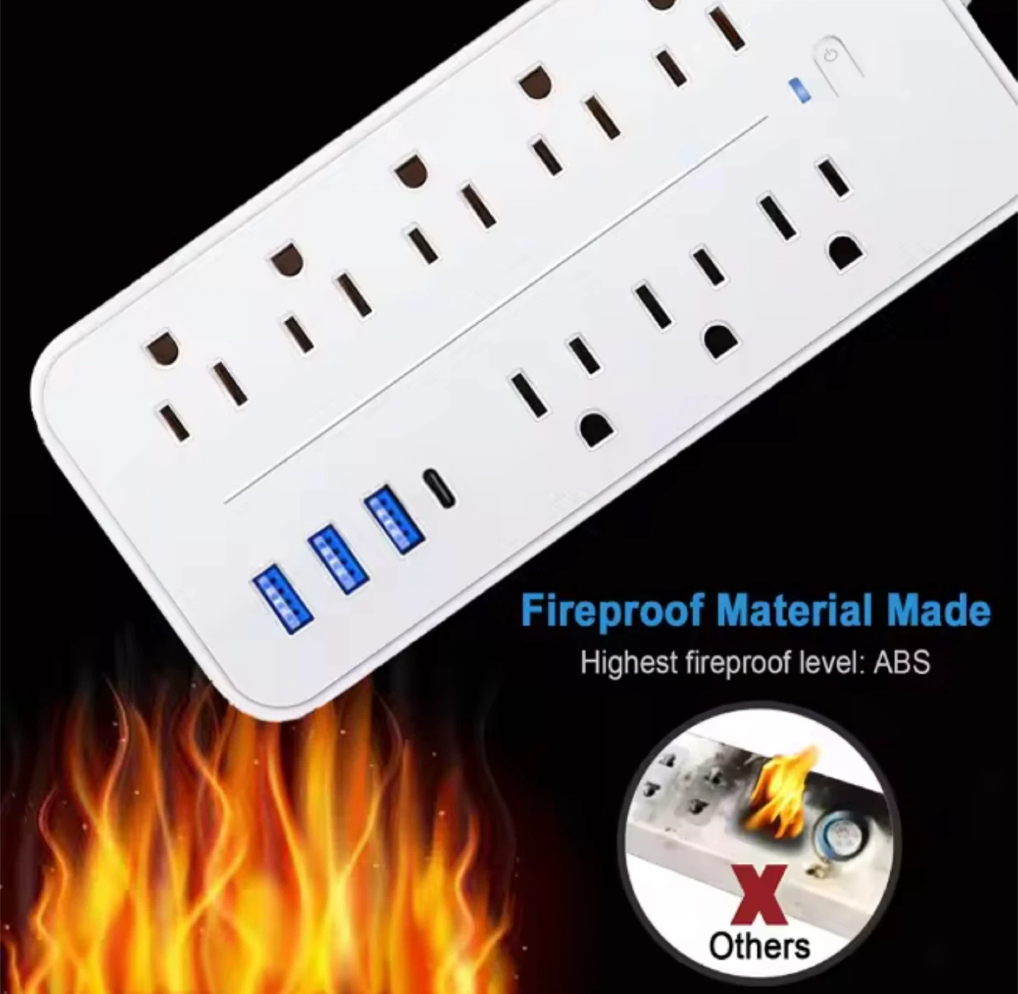 This power strip has 8 AC outlets, 3 USB ports, and 1 Type-C port. It's made with fireproof material and has surge protection with automatic shutoff. It also has high temperature resistance for electricity safety