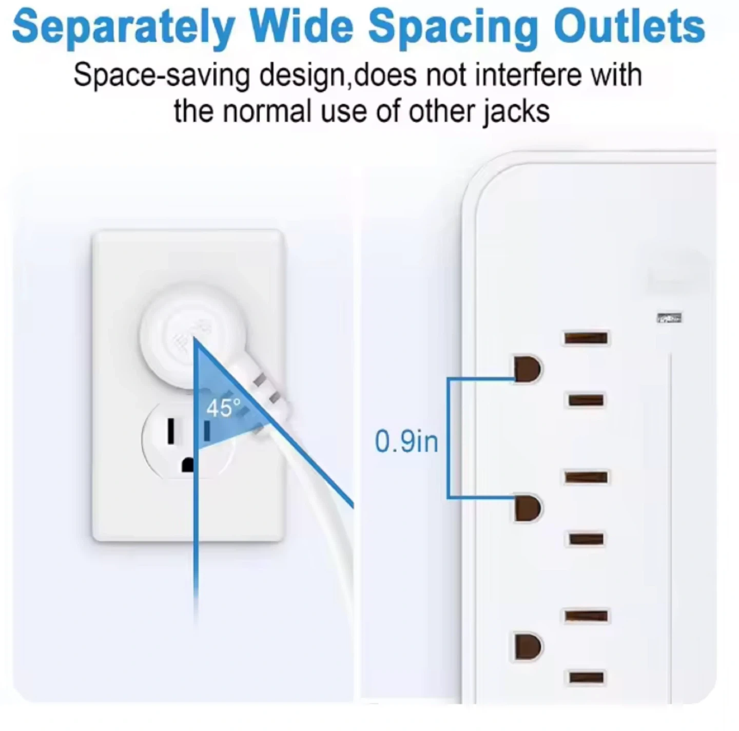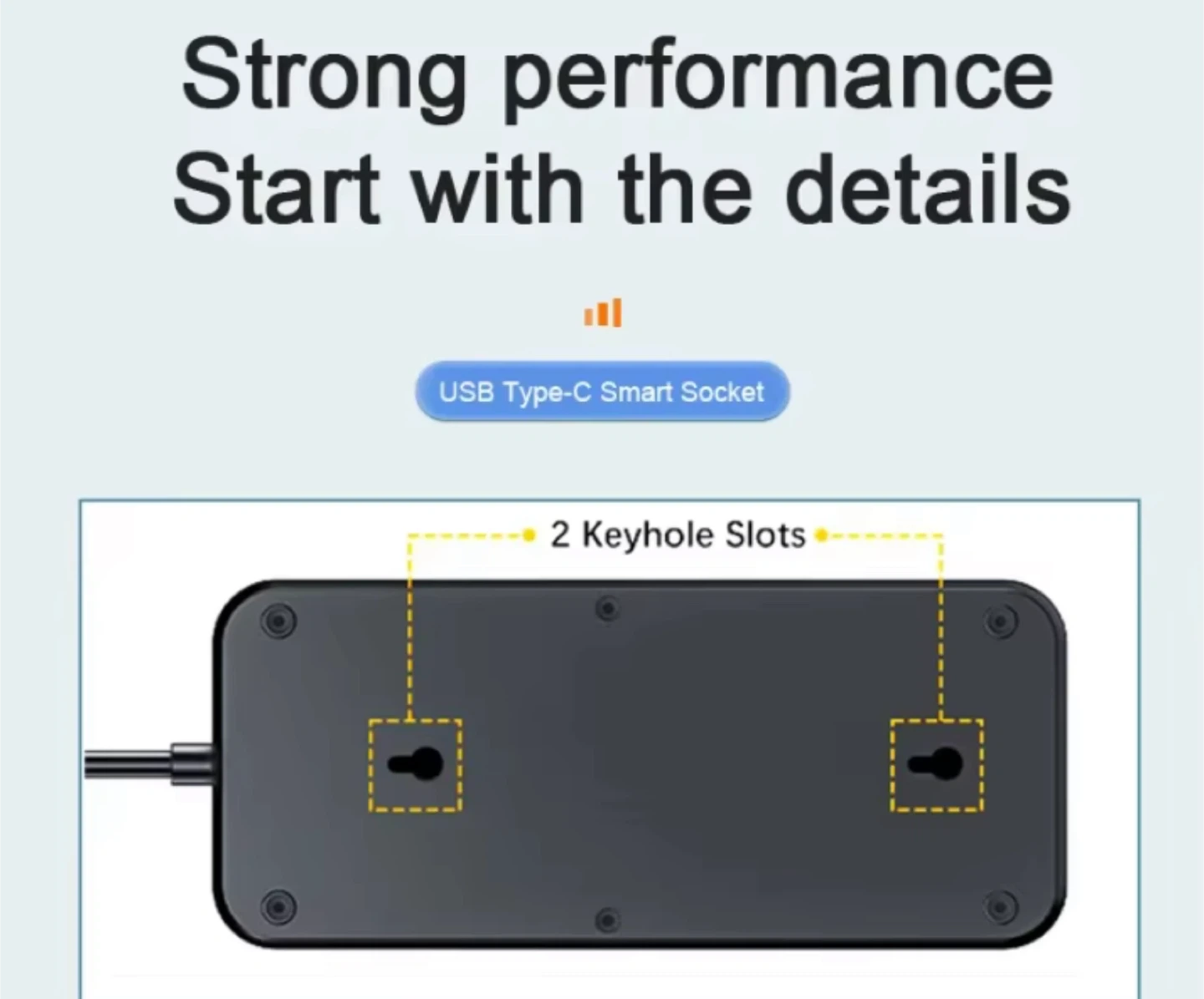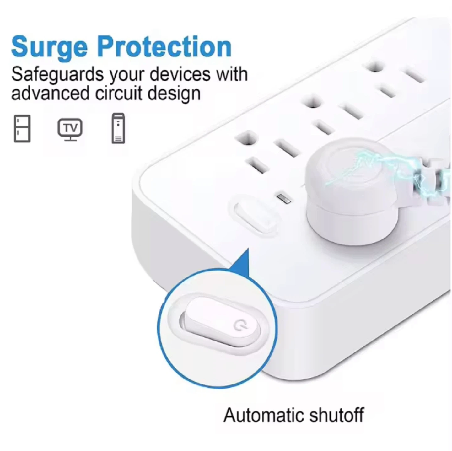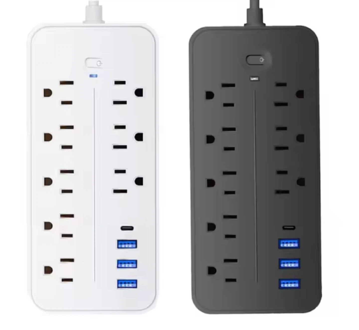 This power strip has 8 AC outlets, 3 USB ports, and 1 Type-C port. It's made with fireproof material and has surge protection with automatic shutoff. It also has high temperature resistance for electricity safety