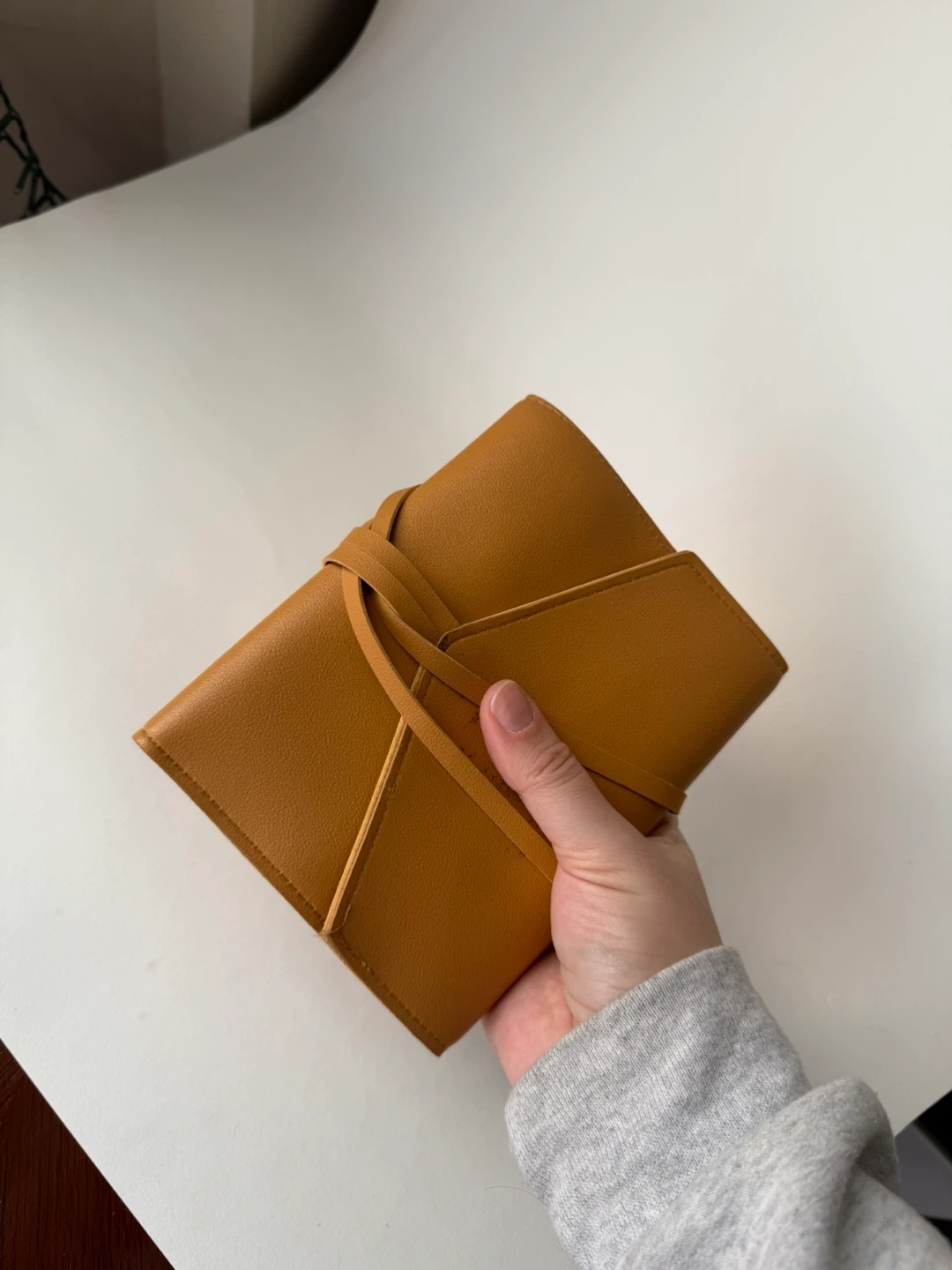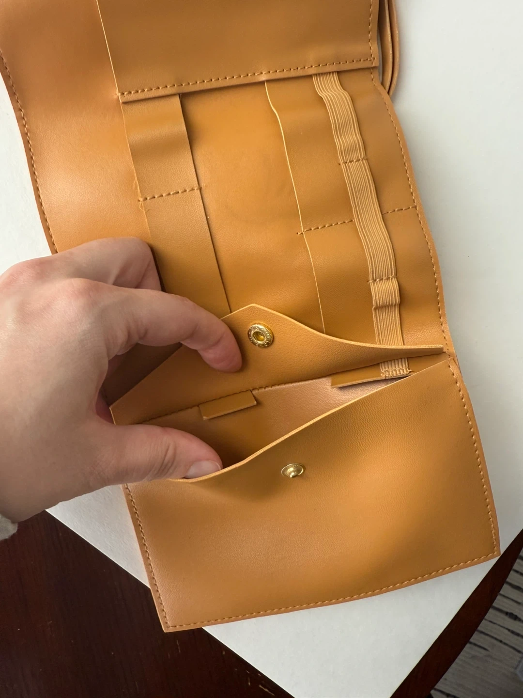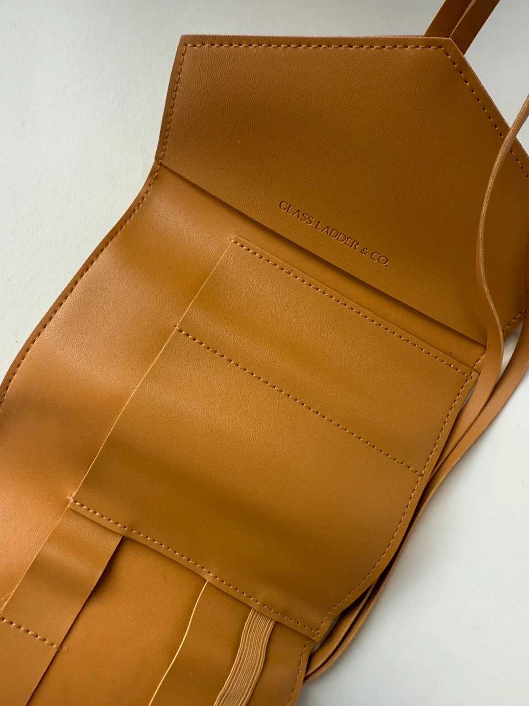 Glass Ladder & Co vegan leather tech organizer clutch in honeyed cognac colour.