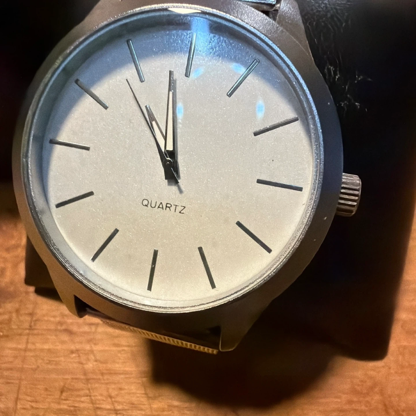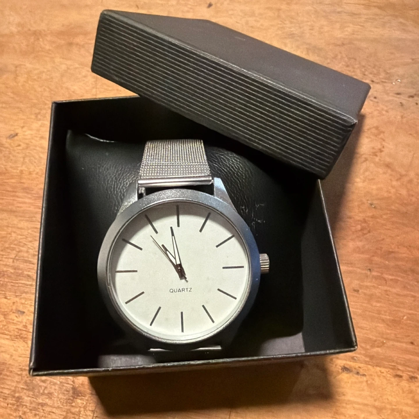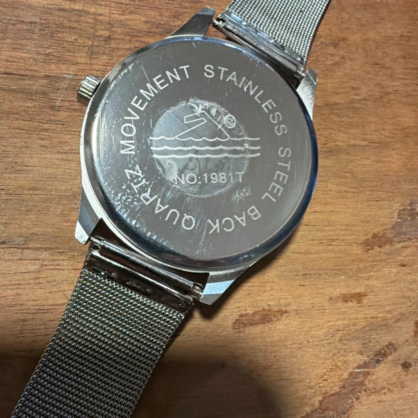 Selling a Quartz watch with a stainless steel band. The back of the watch indicates 'Quartz Movement' and 'Stainless Steel Back'. It comes with its original box. Great for everyday wear!