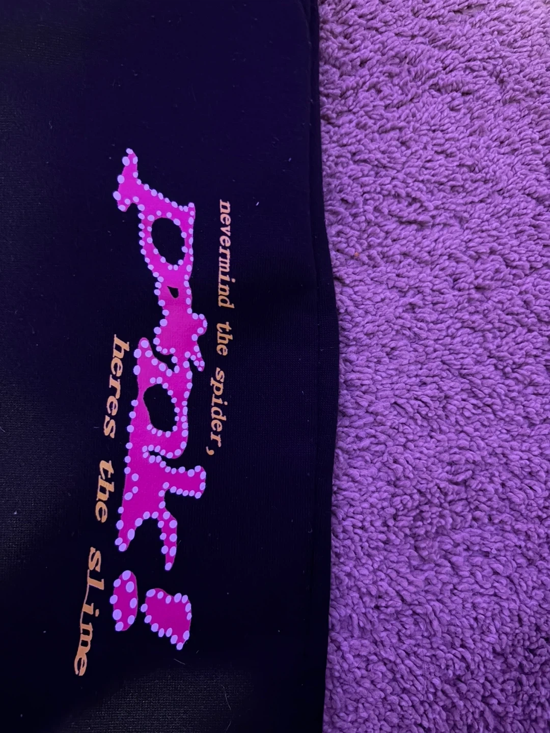Selling a Drakespider black hoodie and sweatpants set. The design features the text 'nevermind the spider, here's the slime' with a spiderweb graphic. Great for fans of the brand!