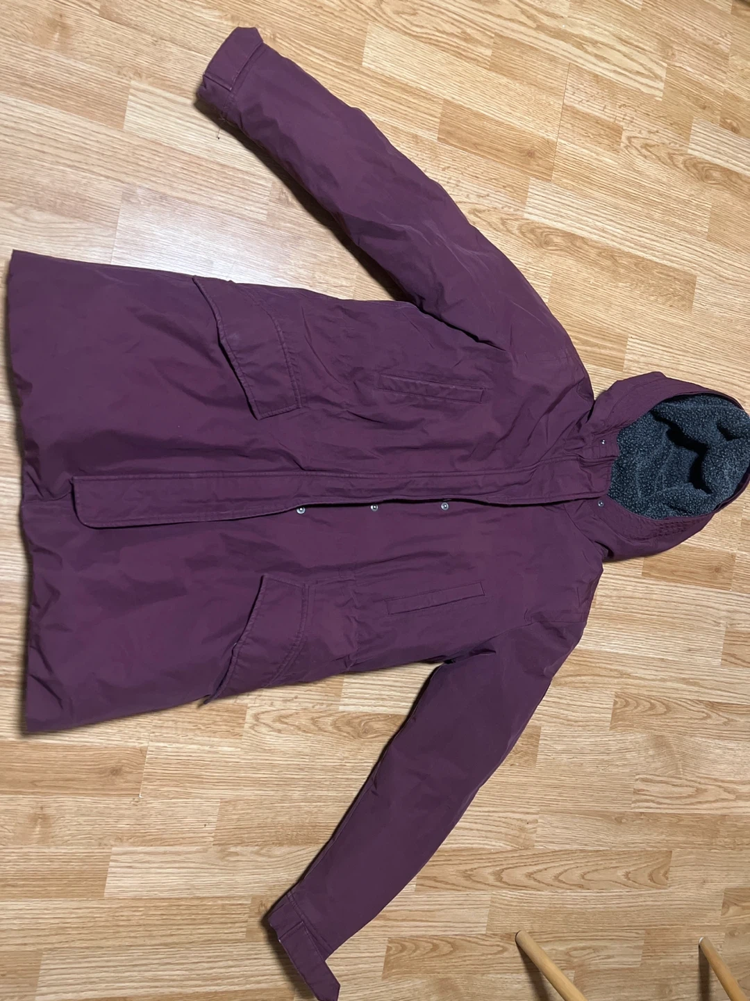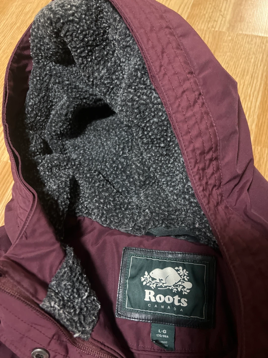 Roots Canada parka in a lovely burgundy colour. It’s a size Large and comes with a cozy lined hood. It has some wear on the cuffs, but it still has plenty of life left.