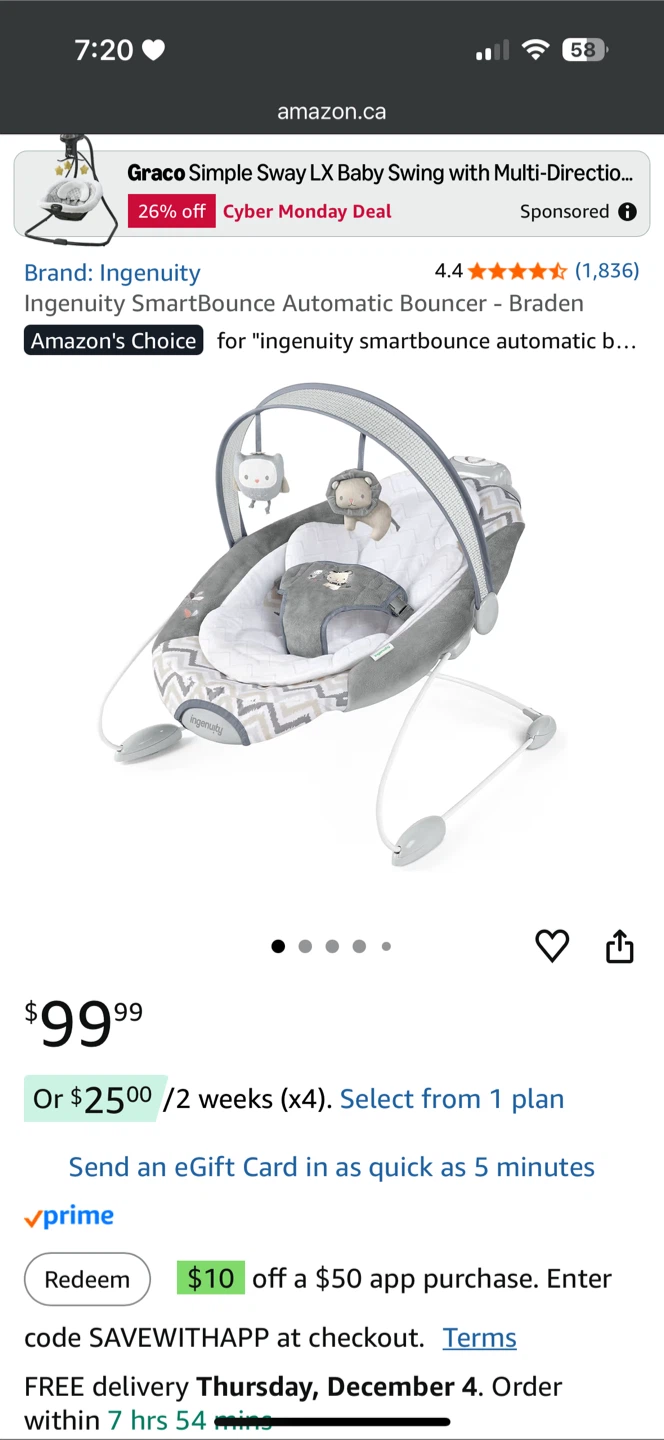 Selling an Ingenuity SmartBounce Automatic Bouncer in great condition! It comes with the original box. The bouncer features a cute grey and white chevron pattern and includes two plush toys attached to the overhead bar. It's perfect for keeping your little one entertained and comfortable