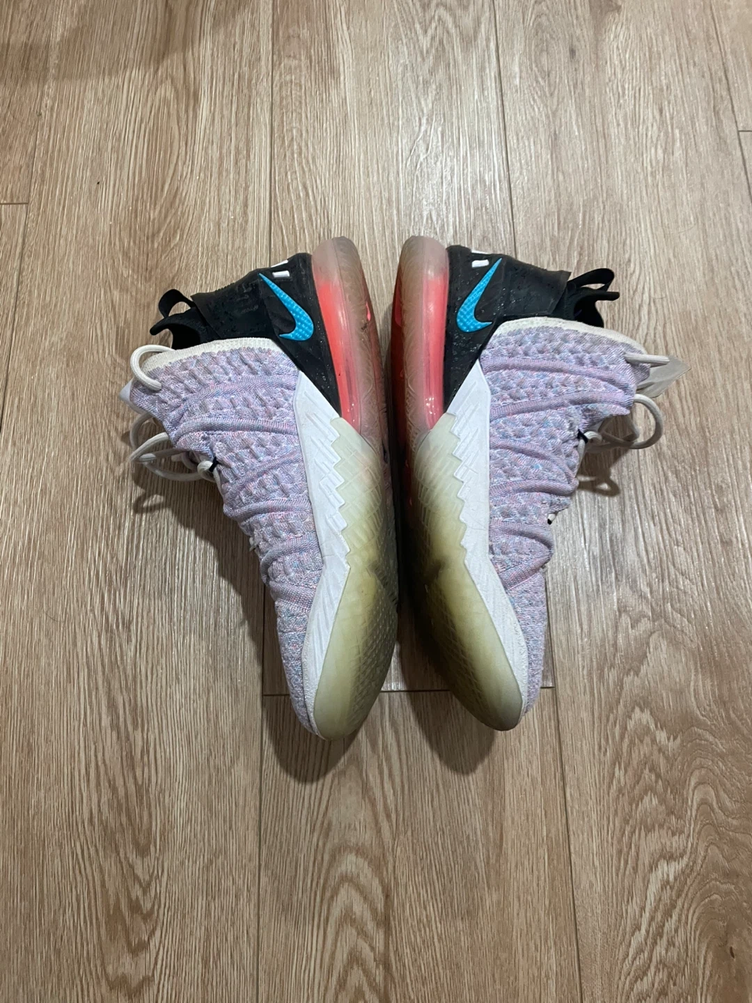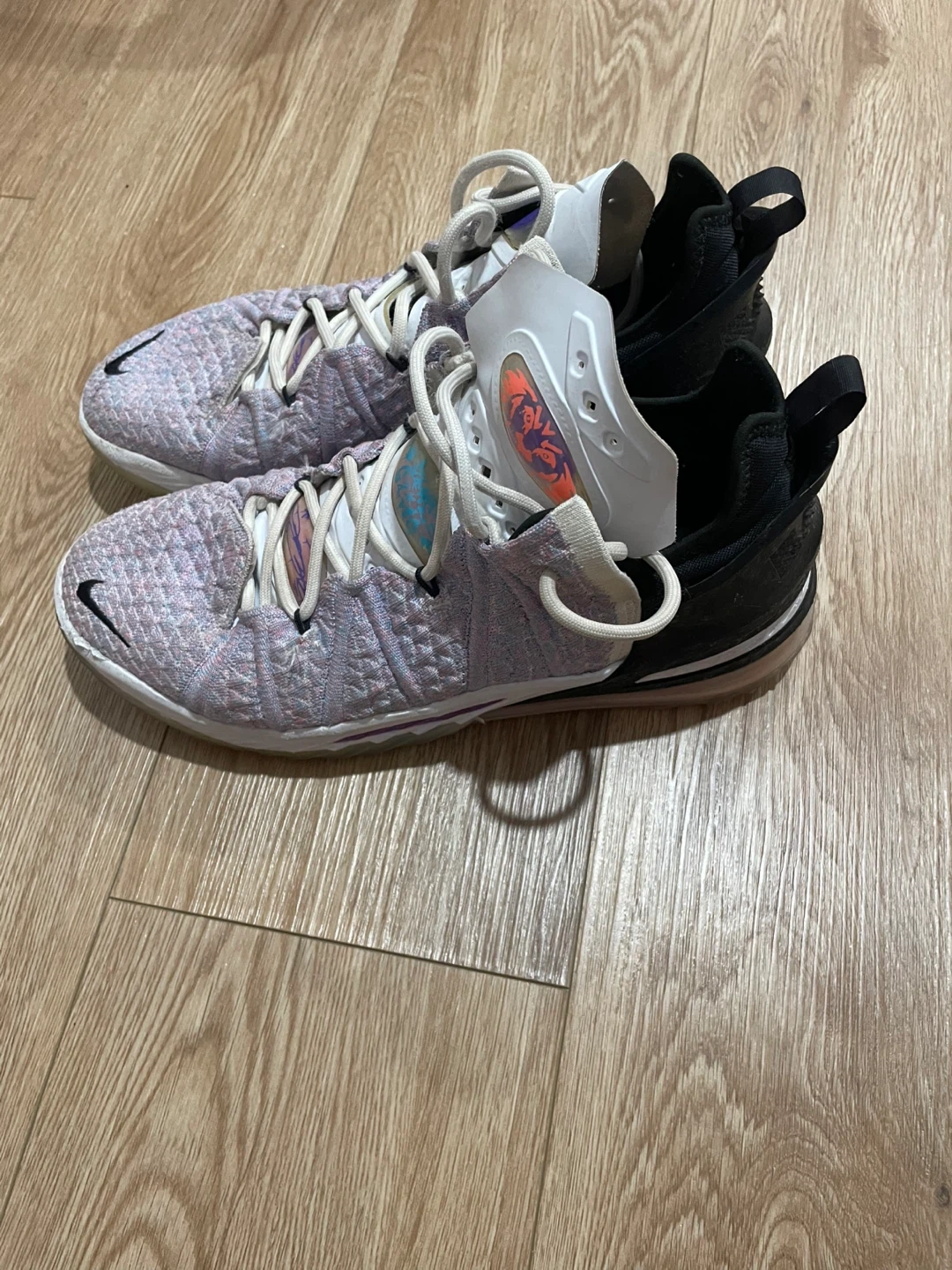 Selling a pair of Nike LeBron XVIII Low basketball shoes. size 8.5 men’s. They're pretty used but they are ready for the court or casual wear. The shoes feature a black Nike swoosh and a white and lavender colour scheme.