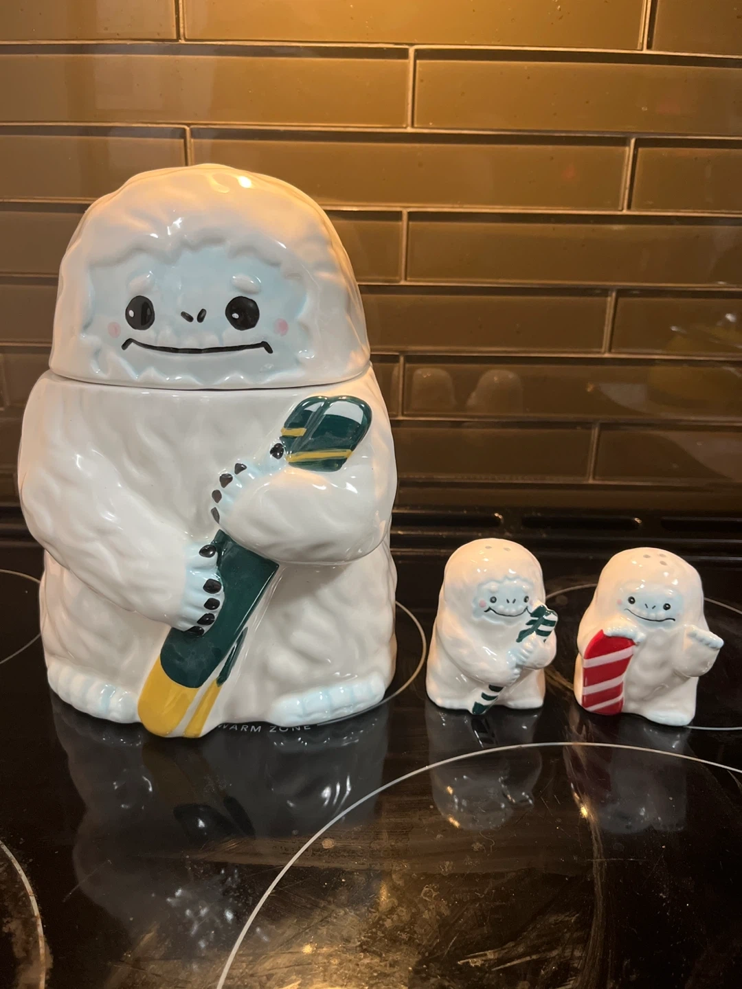 Super cute yeti cookie jar with matching salt and pepper shakers! It's in perfect condition and would be a fun addition to any kitchen or a great gift for a hockey fan as a christmas present