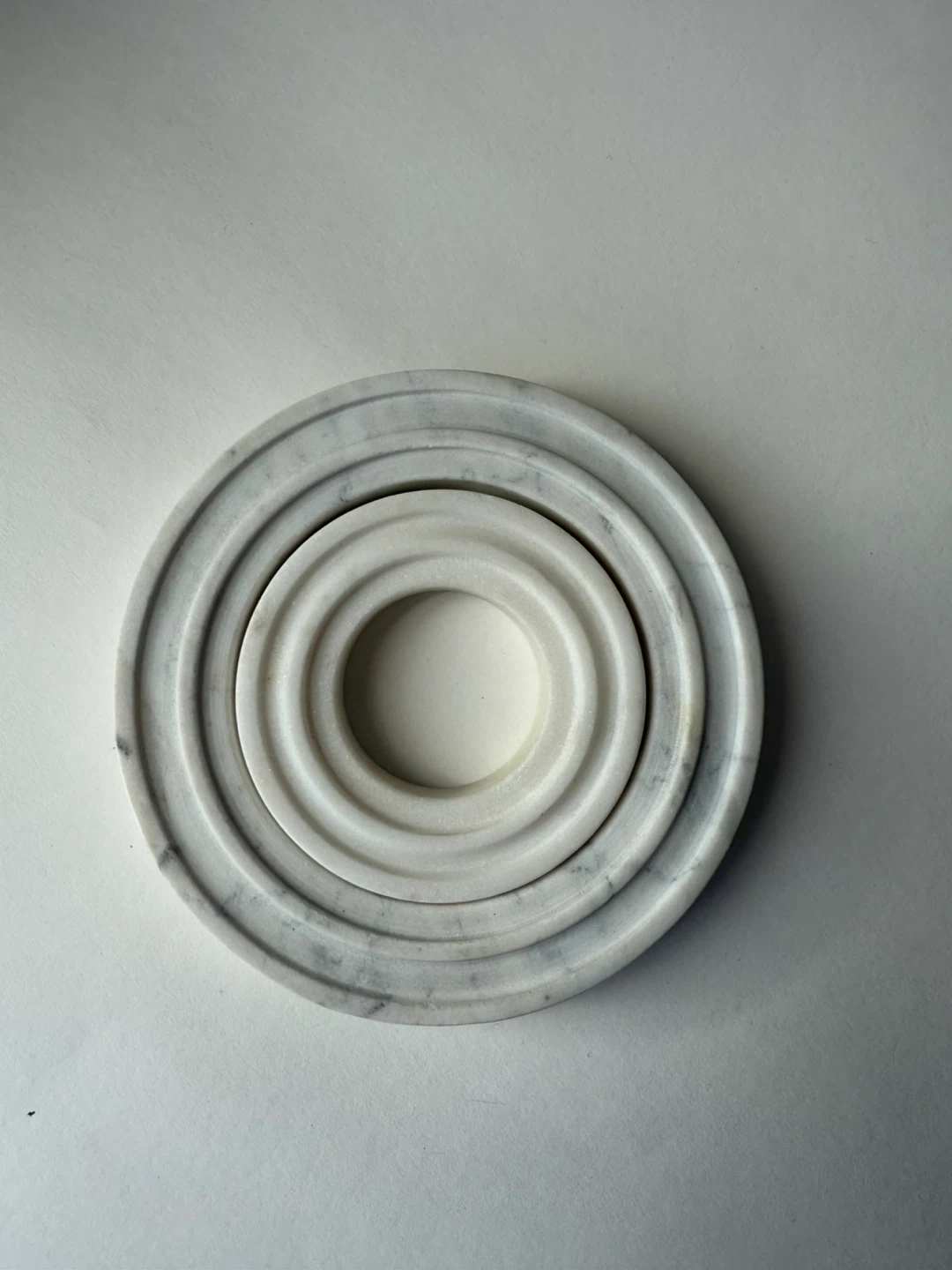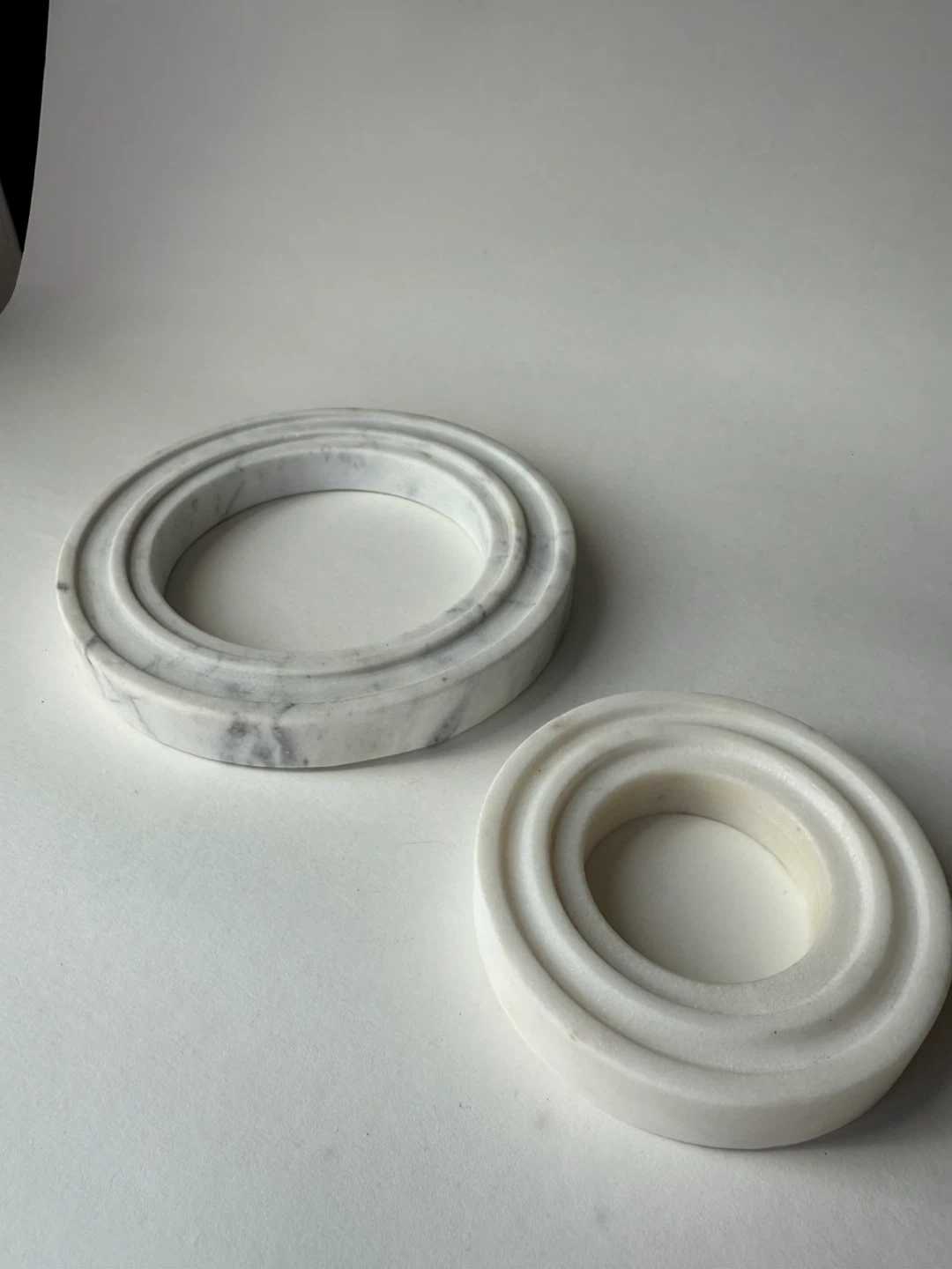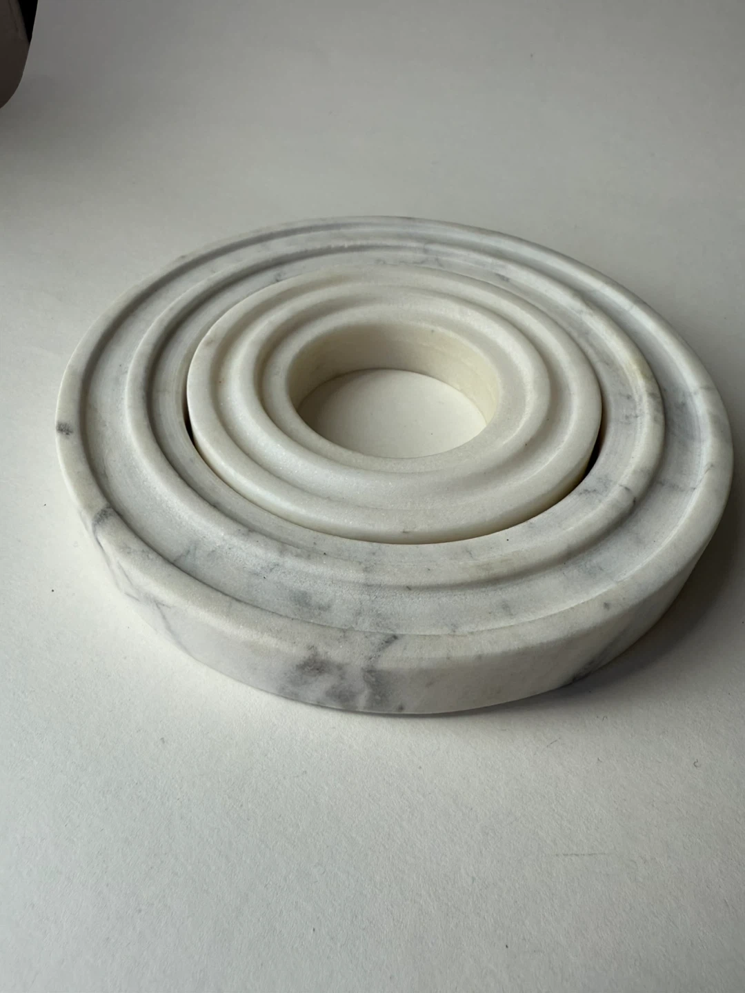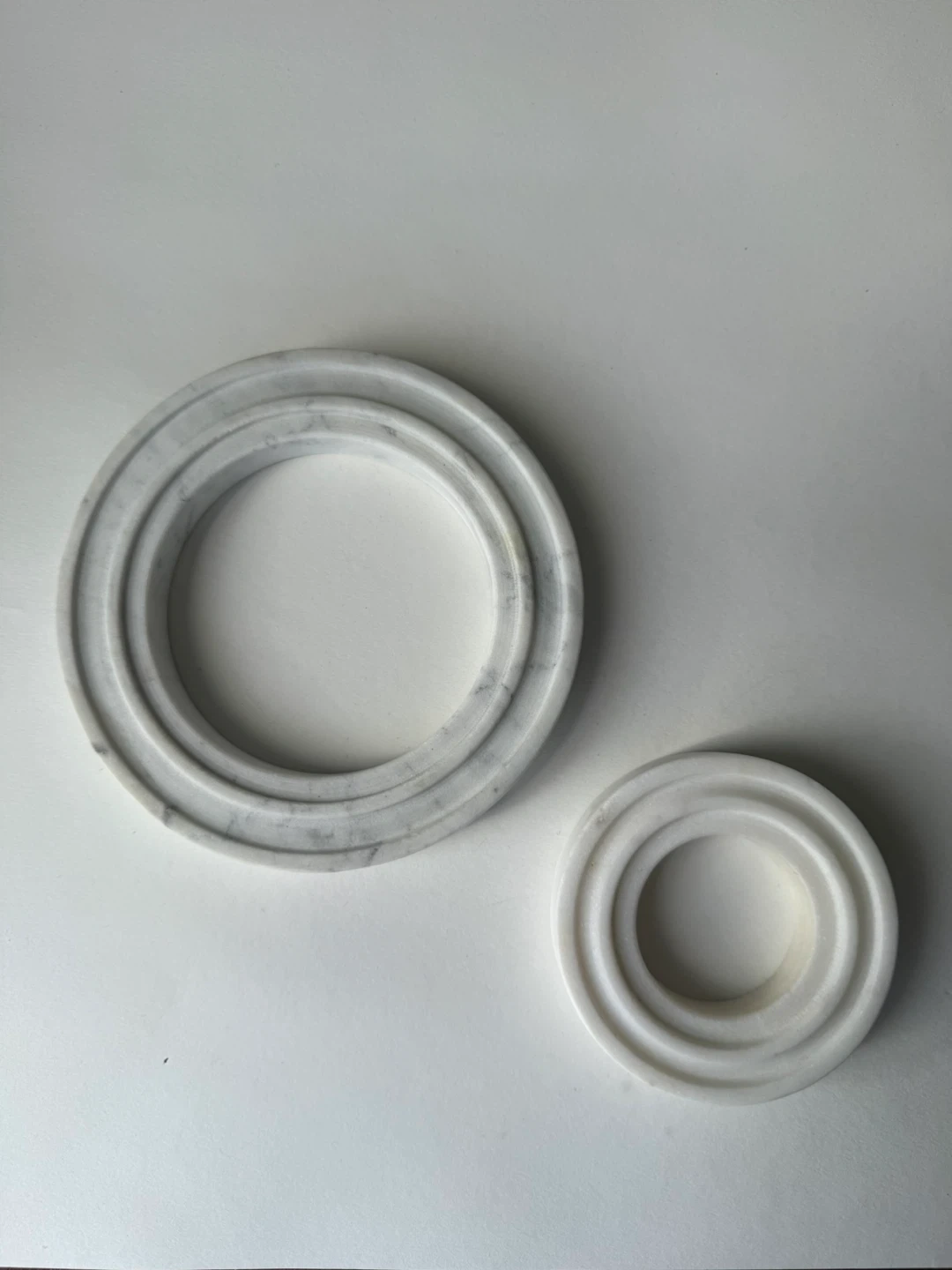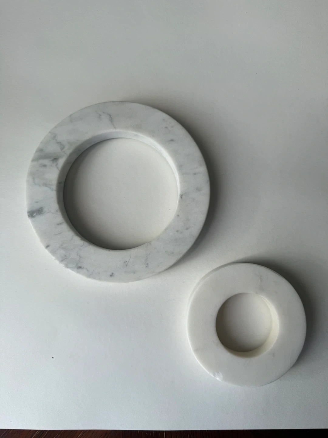 Donut-shaped heavy granite hot pad trivets from CB2 in white and grey. Add a modern touch to your dining table In excellent condition; only one small chip on the underside of the small one. Measures 3 ¾” (small) and 6” (medium)
