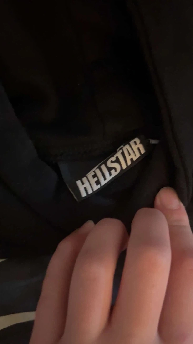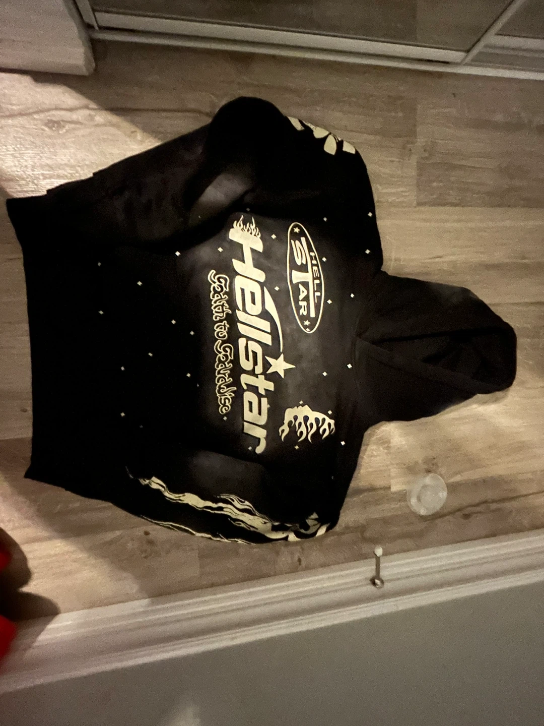Selling a black Hellstar hoodie. The hoodie features a unique design with a star and flaming face graphic. It's in great condition.and it is worn a couple times.