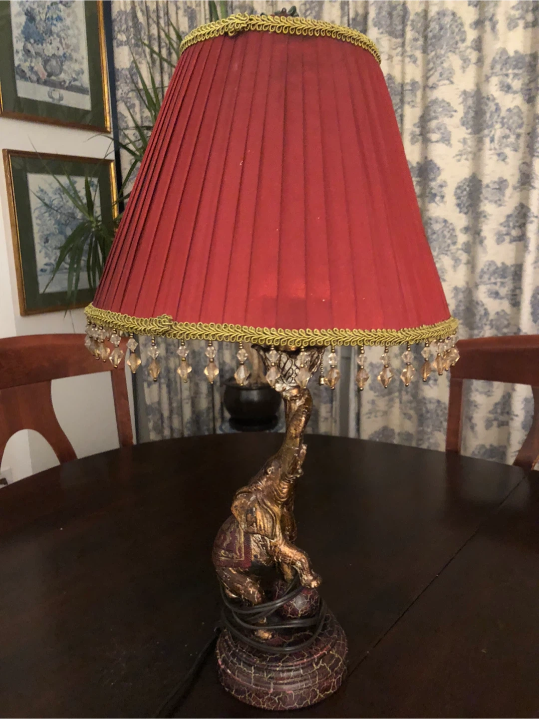 Add a touch of unique charm to your space with this lovely table lamp! It features an elephant base and a red shade adorned with decorative trim and hanging crystals. The base has a beautiful, intricate design that adds to its overall appeal