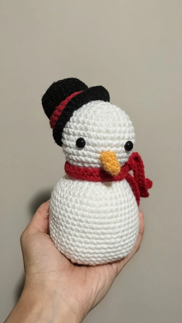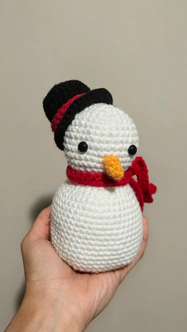 A cute crocheted snowman, perfect for winter decor! This little guy has a black top hat with a red stripe, a red scarf, and a carrot nose. He's handmade and ready to bring some cheer to your home. 6.5 inches tall.