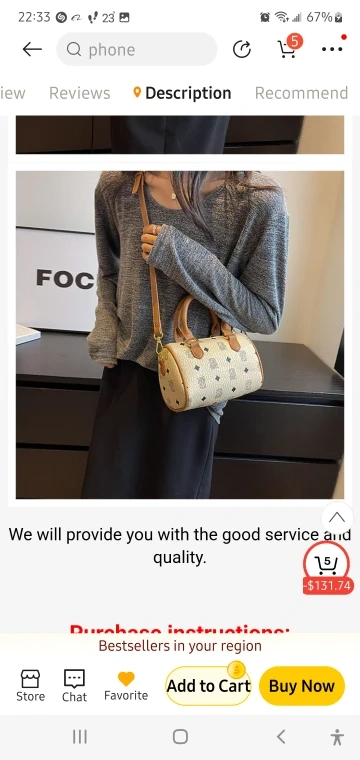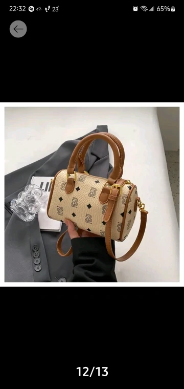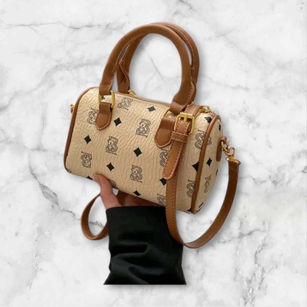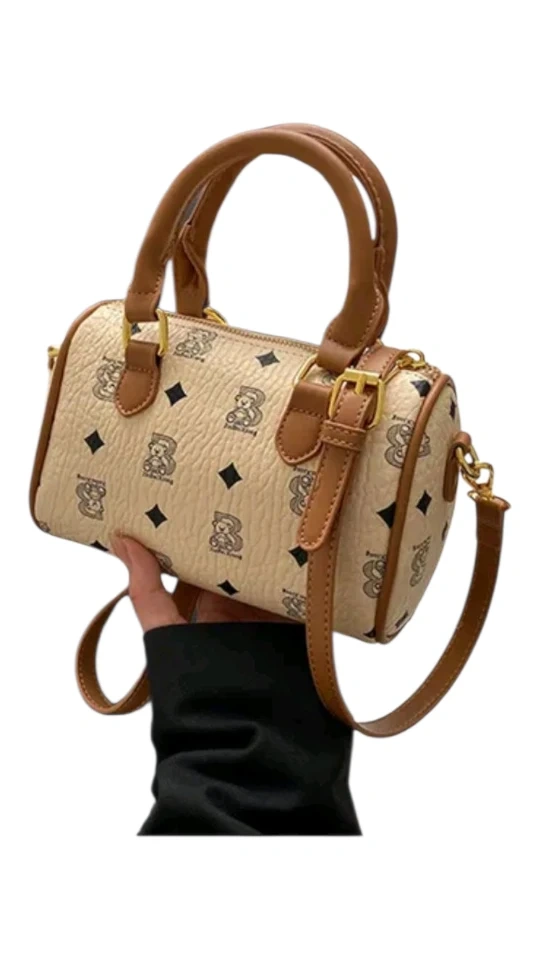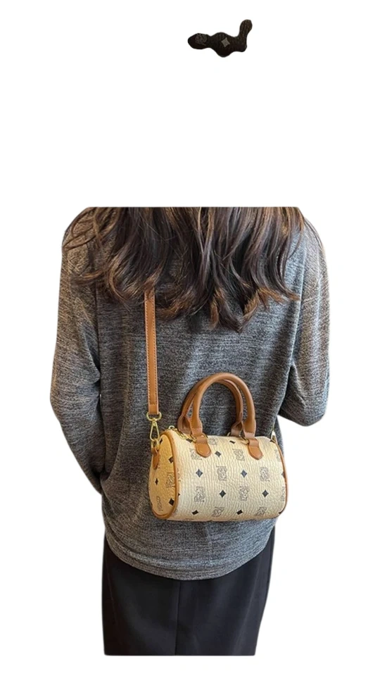 This is a cute barrel-shaped bag with a unique pattern and brown accents. It comes with a shoulder strap for easy carrying. Perfect for adding a stylish touch to any outfit!