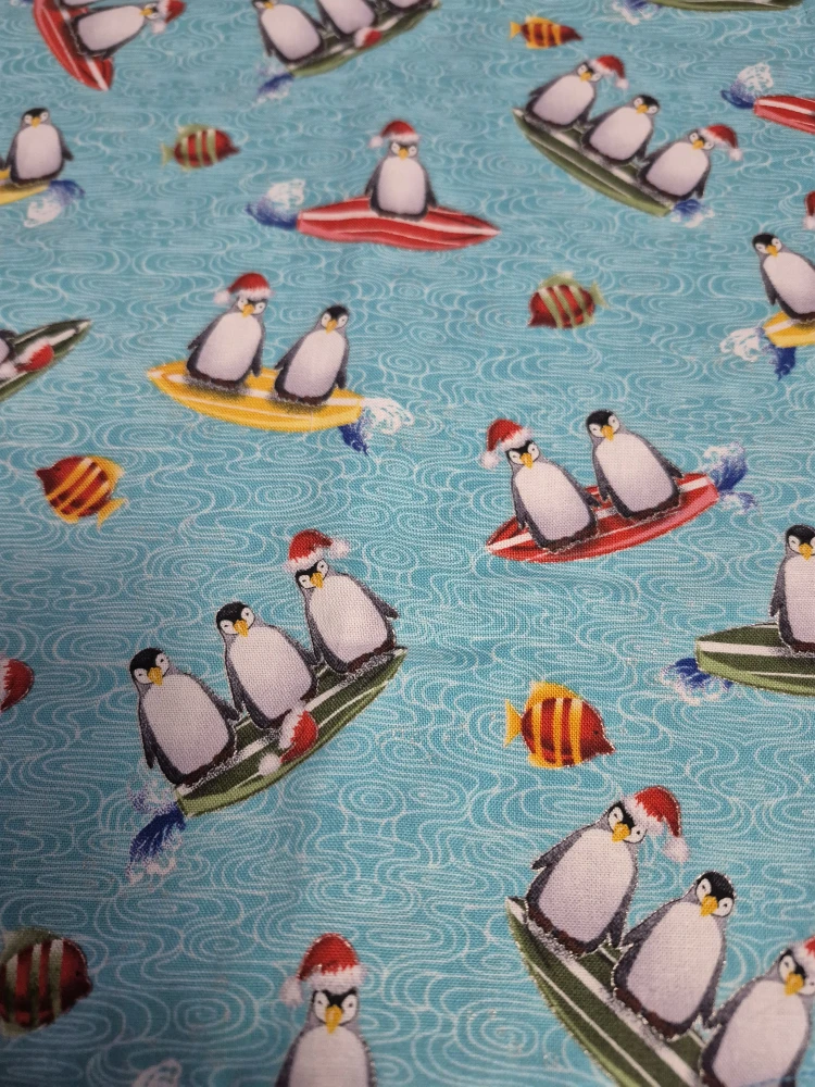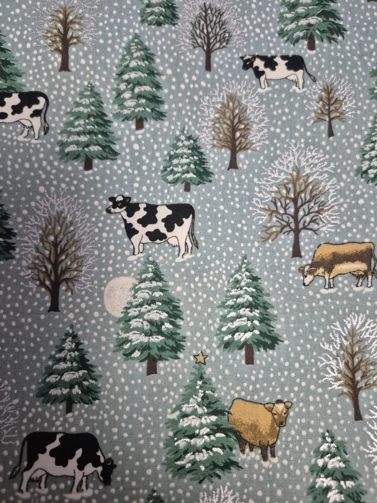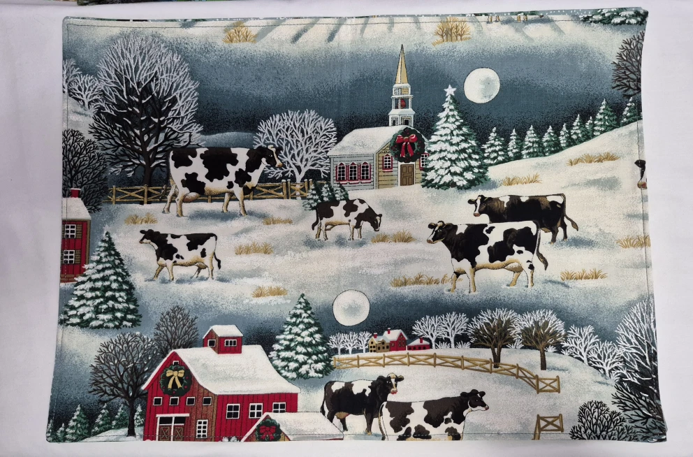 I'm selling a set of four handmade placemats with various Christmas-themed prints. They feature cows, penguins, barns, and Christmas trees, all in a festive, wintery style. Perfect for adding a touch of holiday cheer to your dining table!
