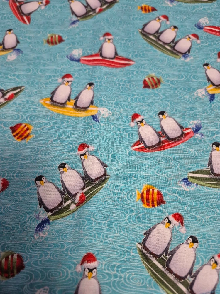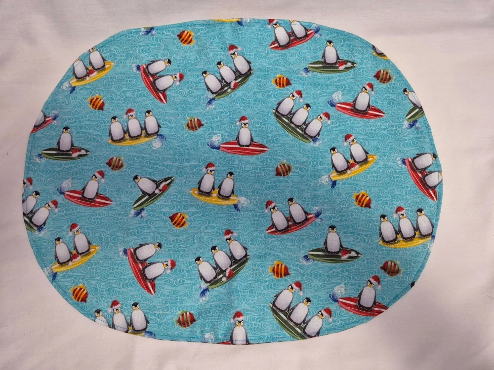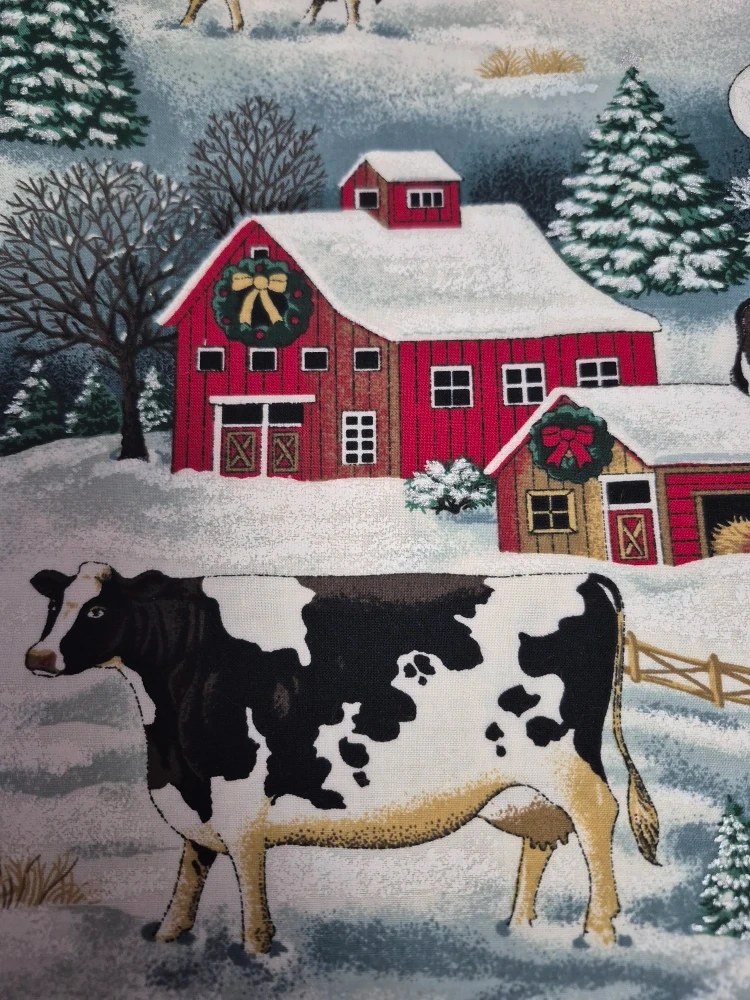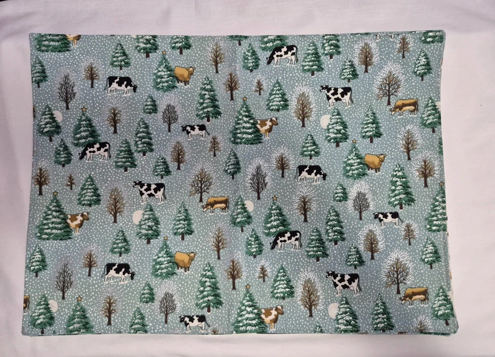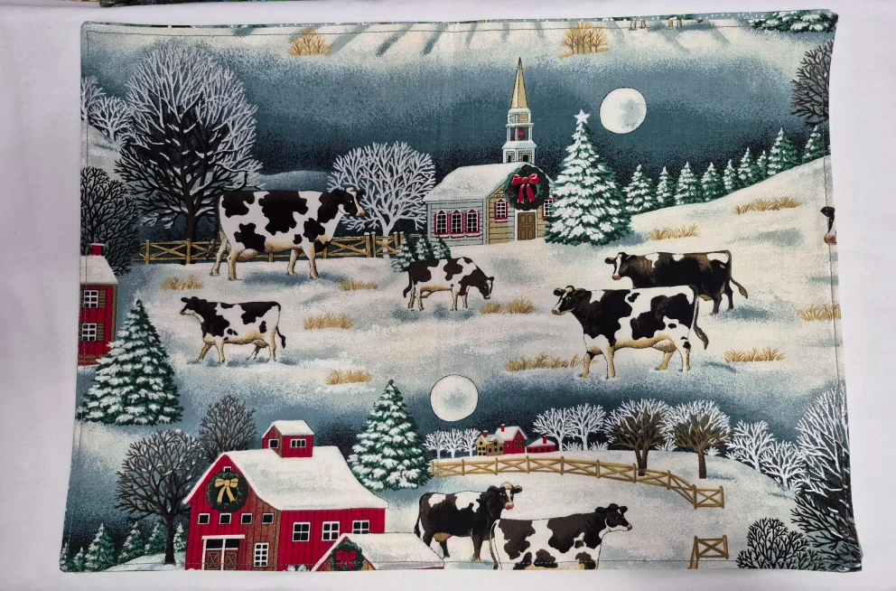 I'm selling a set of four handmade placemats with various Christmas-themed prints. They feature cows, penguins, barns, and Christmas trees, all in a festive, wintery style. Perfect for adding a touch of holiday cheer to your dining table!