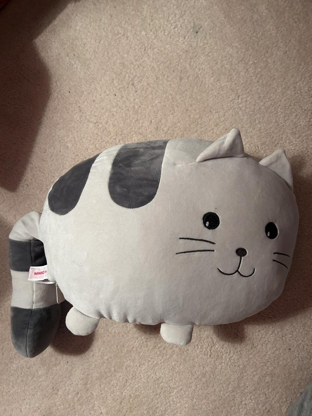 Selling a super cute Miniso cat pillow! It's a plush stuffed toy in excellent condition. This adorable pillow originally sold for $26 at Miniso. Perfect for cuddling or as a decorative piece!