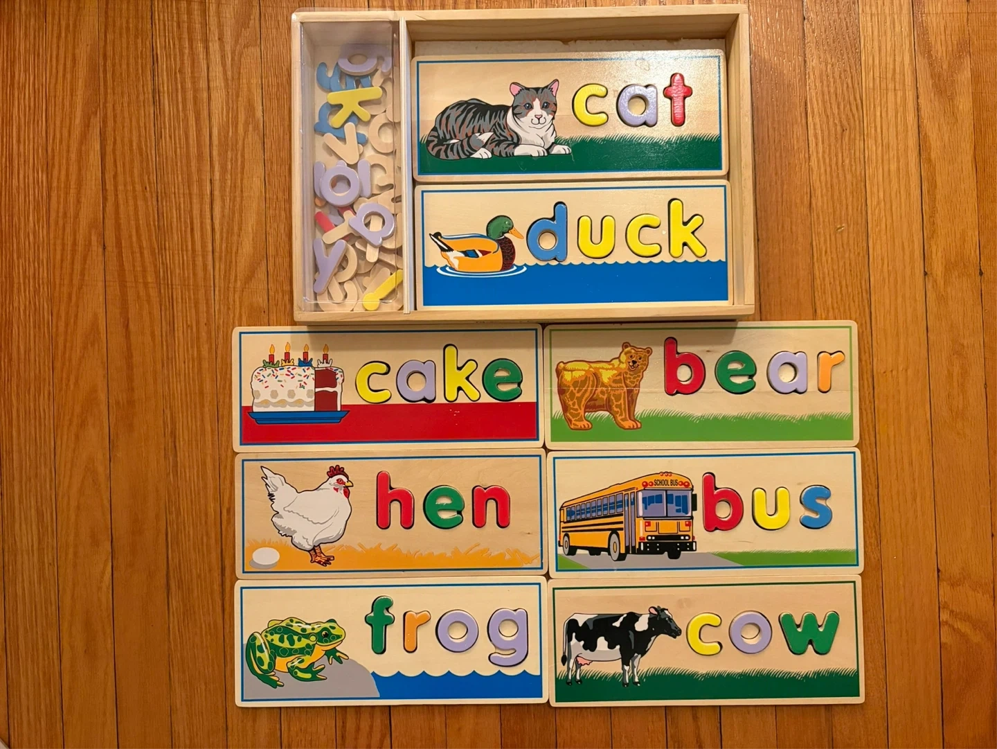 Here's a fun wooden puzzle set to help your little one learn to spell! It includes a variety of colourful picture and letter pieces to match together and spell simple words like cat, duck, cake, bear, hen, bus, frog, and cow. Great for early learning and development.
