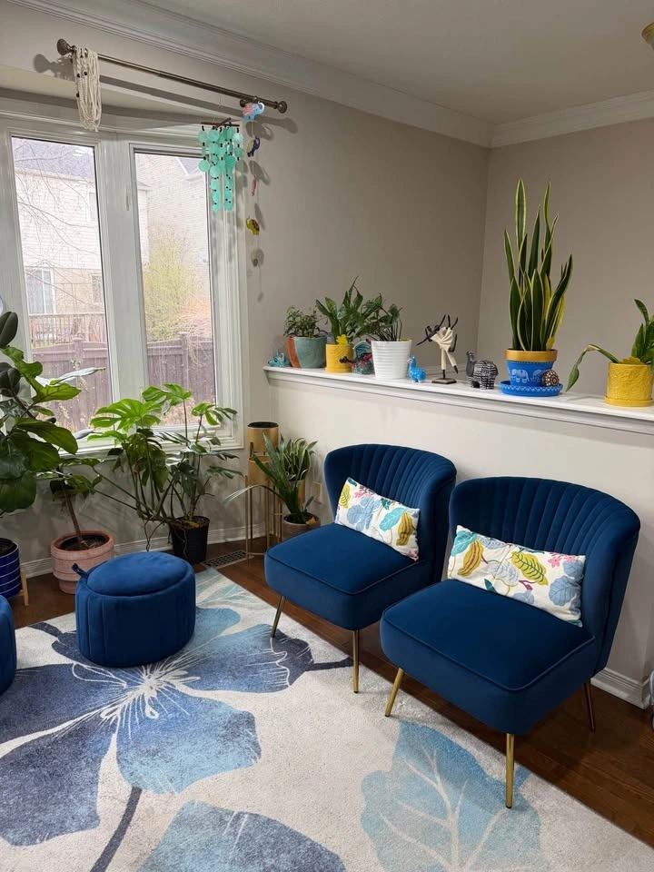 3 Seater Royal blue velvet sofa set with two accent chairs and two Ottomans. Comes with cushions. Bought last year, selling because we are relocating.