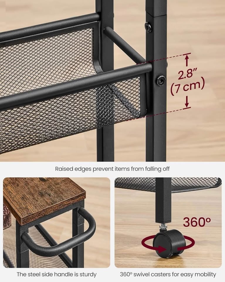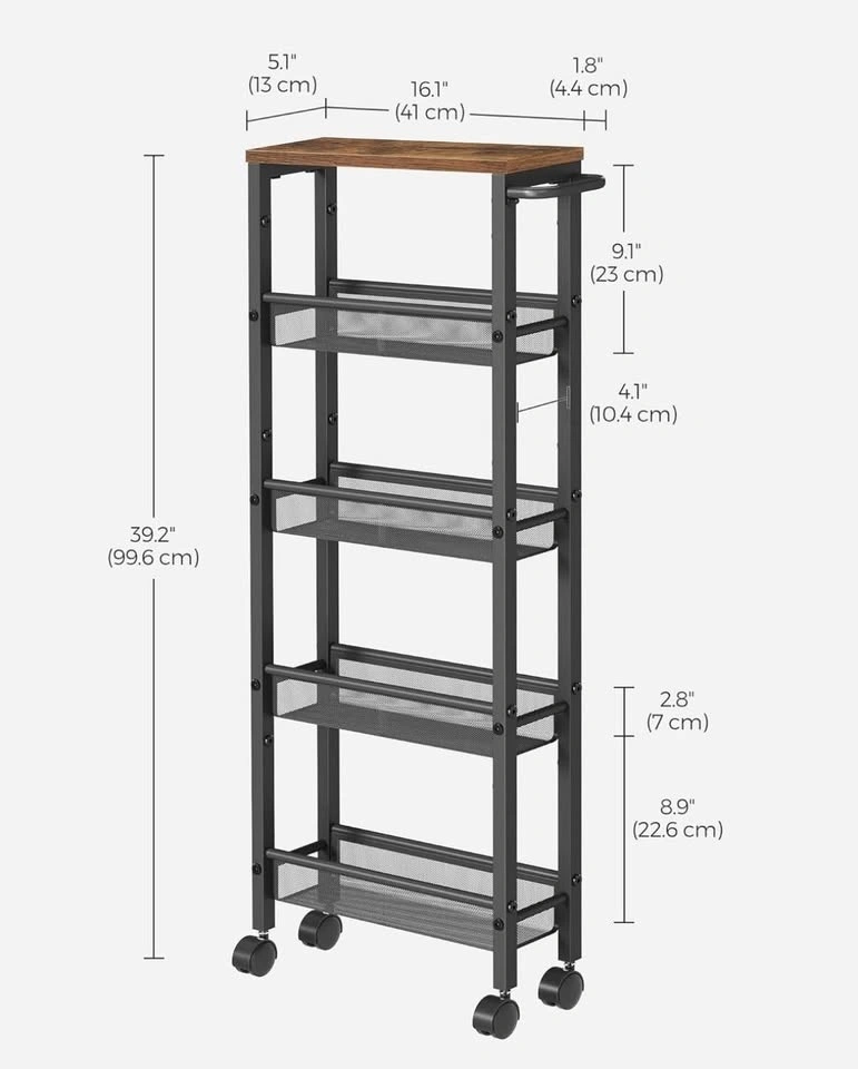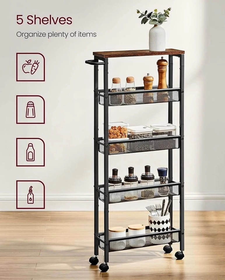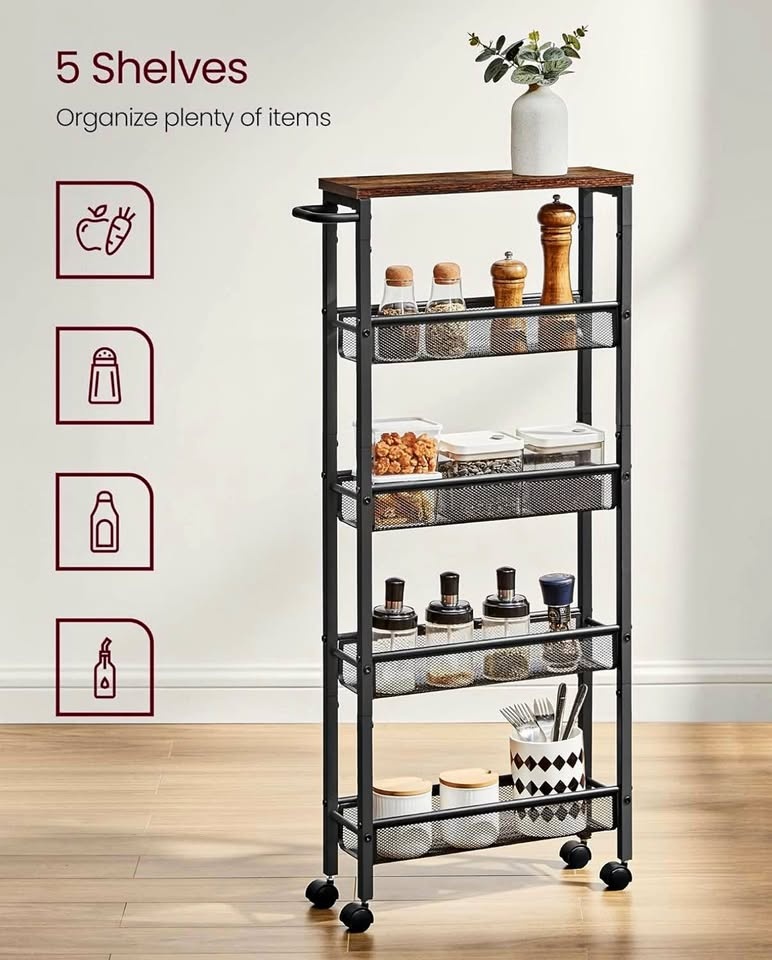 Looking for extra storage without taking up space? This brand-new, never assembled VASAGLE Slim Rolling Cart is perfect for any kitchen, dining room, bathroom, or home office. Its narrow 5-tier design fits easily into tight spaces, and the sturdy metal frame with rustic wood shelves looks beautiful in any home.