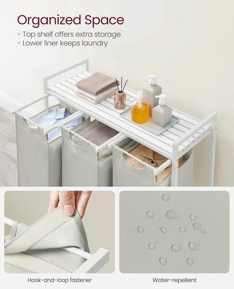 It features three pull-out, removable 40 L bags, a sturdy metal frame, and a convenient top shelf for detergents, baskets, or folded clothes.