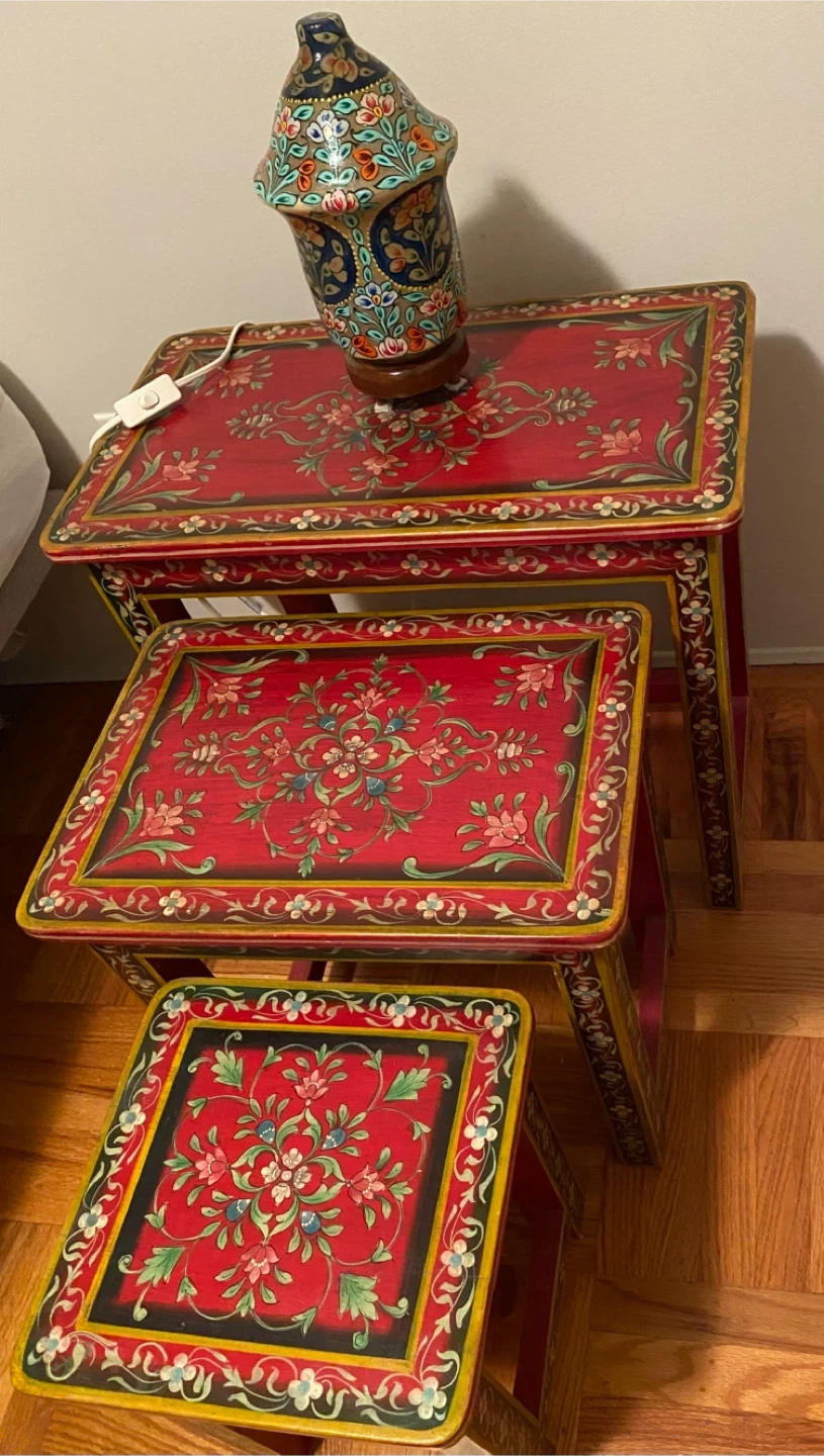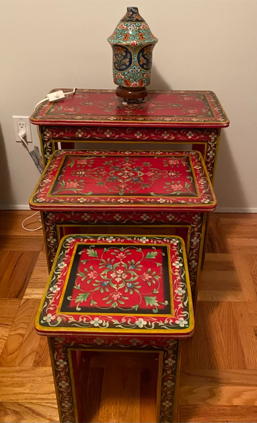 These are a set of three nesting tables with a beautiful red floral pattern. They're perfect for adding a pop of colour and style to any room in your home. They nest together for easy storage, making them great for smaller spaces. They are in great condition and ready for a new home!