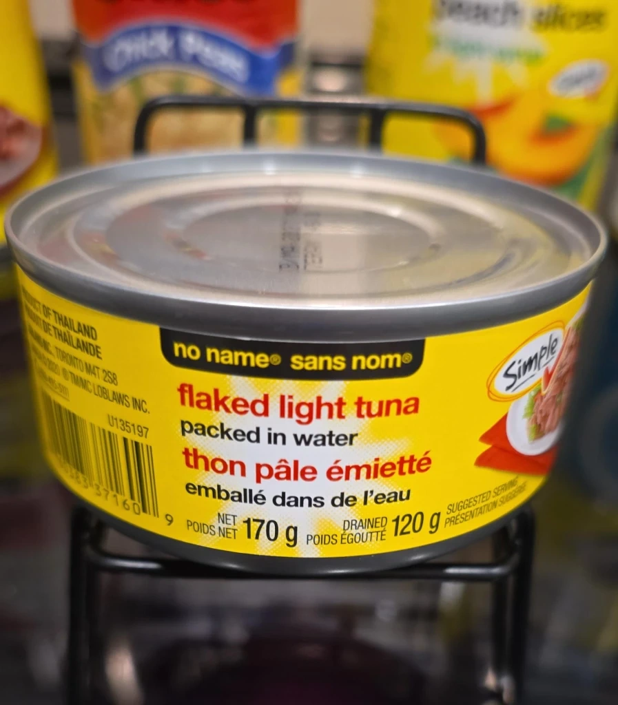 Reorganizing my pantry! Free can of No Name flaked light tuna packed in water. The net weight is 170g, and the drained weight is 120g. The best before date is 2027 May 25.